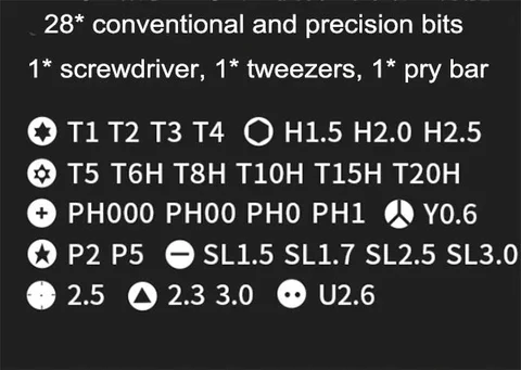 This screwdriver set has 28* conventional and precision bits, 1* screwdriver, 1* tweezers, 1* pry bar. The upgraded extended drill bit is 10mm longer than the ordinary one, which is convenient for disassembly and assembly of deep screws.