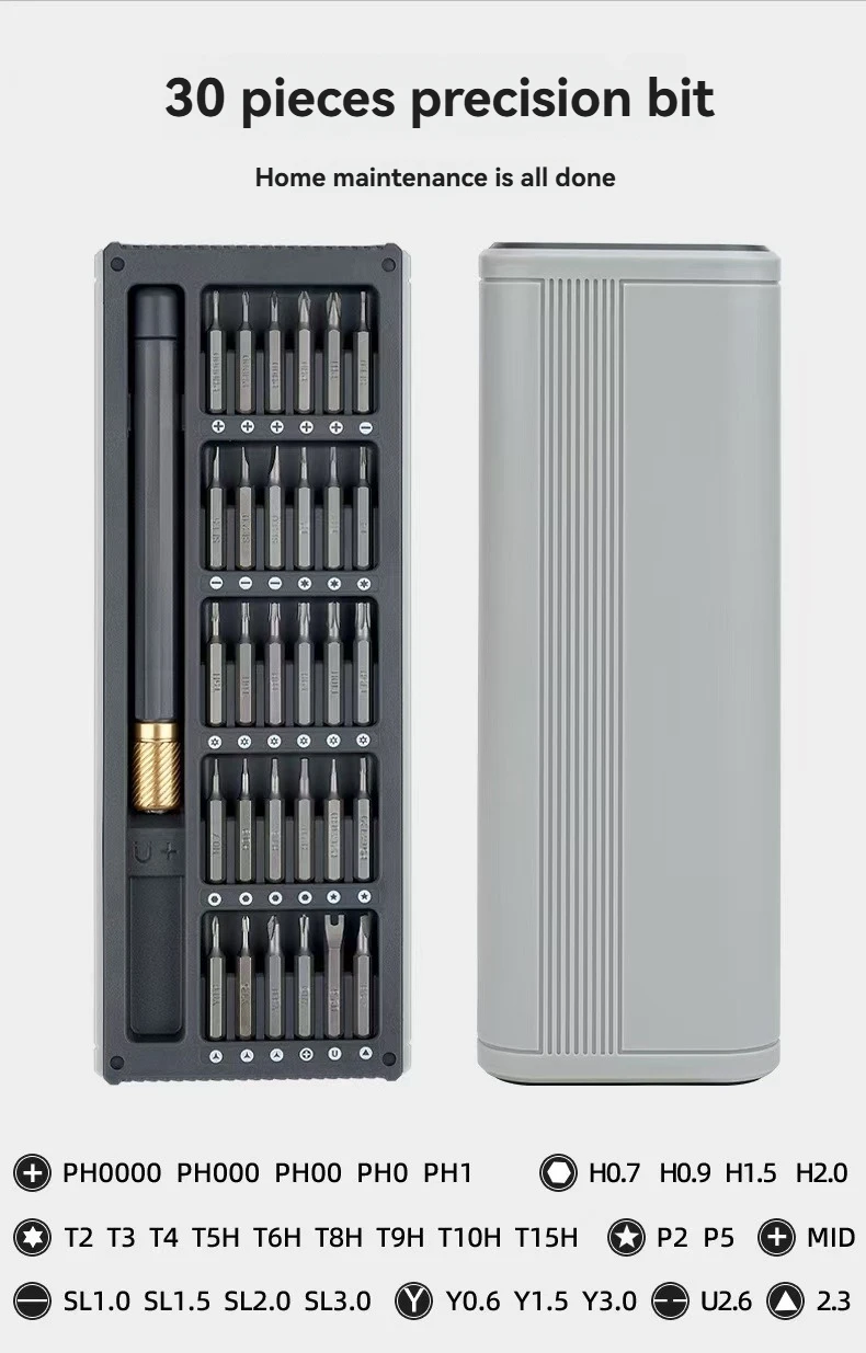 30pcs finishing bits, cross, one type, plum blossom, hexagon, five star, Y type, hexagon, U type, triangle, big cross and so on. Wide range of use, disassemble a set to get it done.