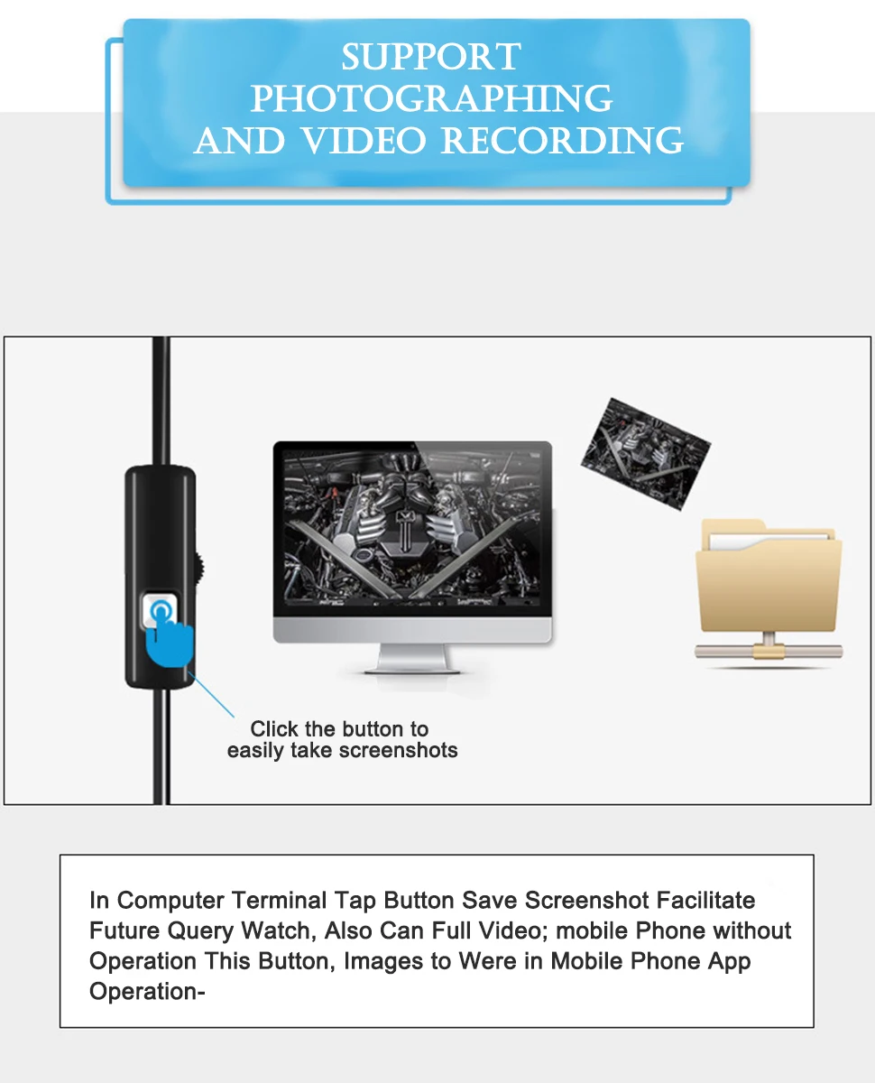 The borescope camera with 0.21in/5.5mm ultra thin probe can inspect any hard-to-reach narrow and confined places without efforts, Helps shoot HD photos and smooth videos.