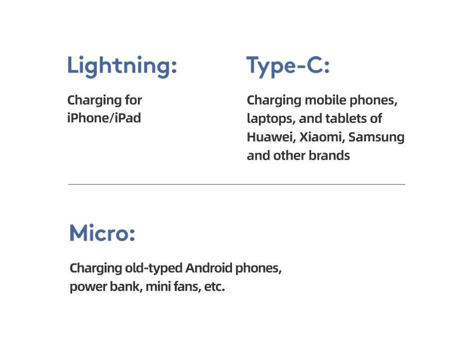 Compatibility: For devices with Type-C/Lightning/Micro port