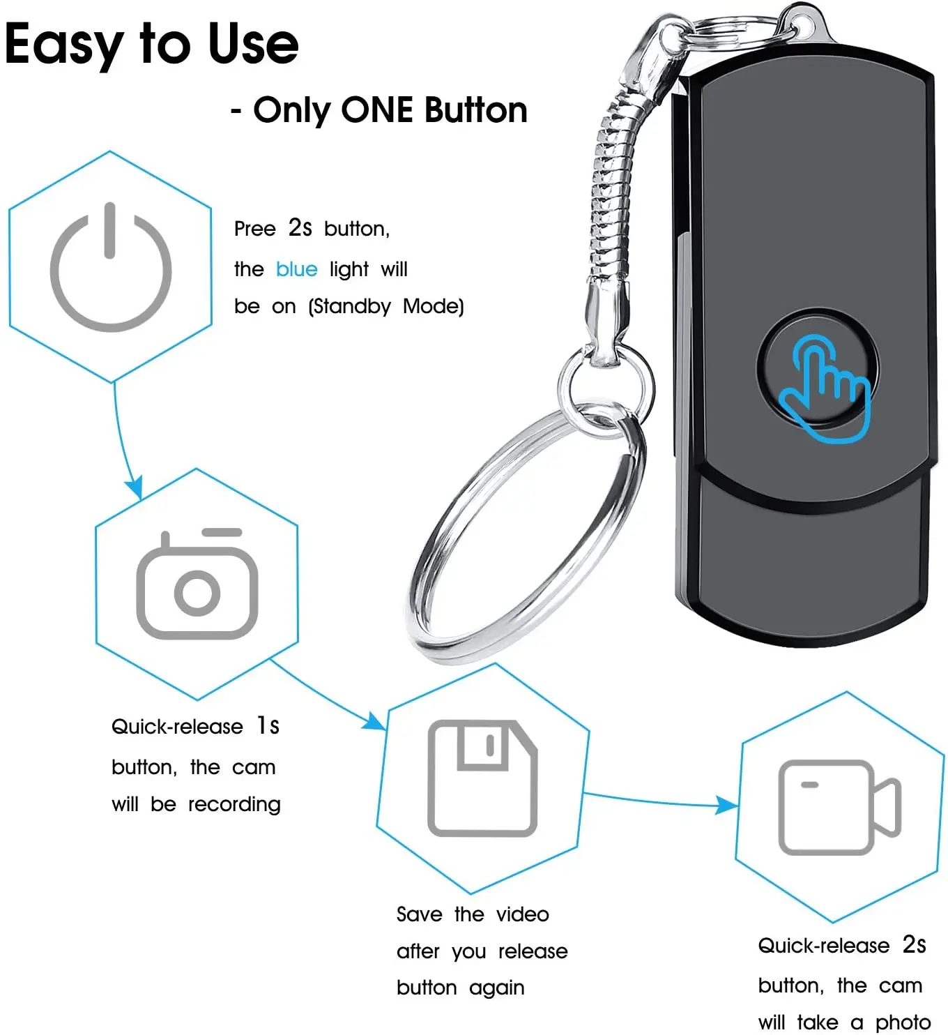 2. In standby mode and without any press of the button, mini camera will shut off automatically to save powers after one Minute