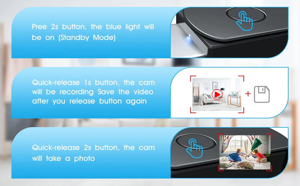 Our security camera just one button to operate and threes step to record. Please remember full charge and built-in SD in the camera ahead of first using. Supports up to 32GB capacity micro SD card