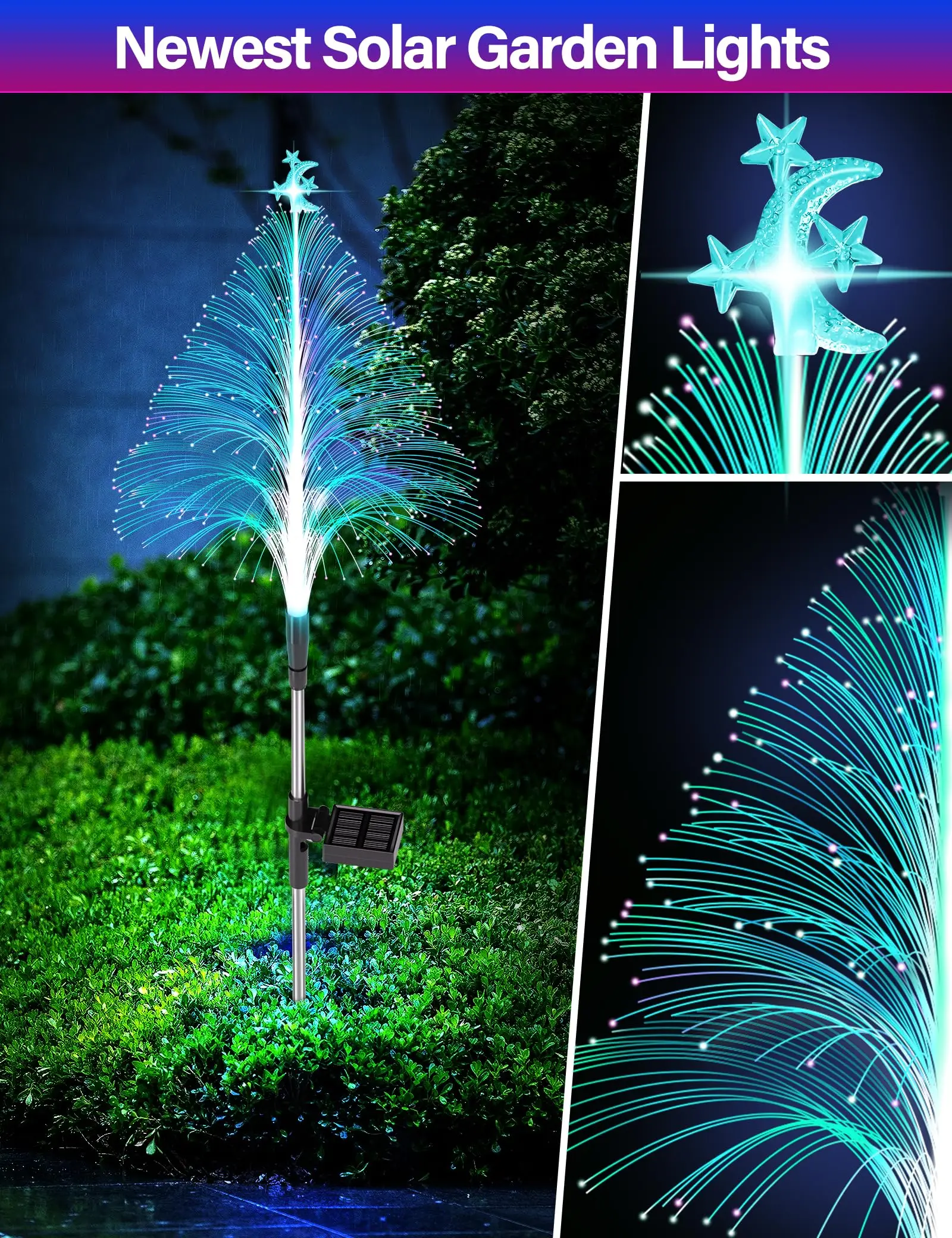【Unique solar Christmas trees】: Solar garden lights simulate the shape of the real Christmas tree, unlike ordinary pine, solar garden lights are made of high quality fiber optics and ABS material, decorated with fun moon and star accessories on the top. Features strong light transmission, stronger light and RGB colorful light changes. Great for garden, yard, patio, discount, fence, lawn, walkway, pathway, backyard, courtyard, front yard, campsite, landscape light, Christmas decorations!
