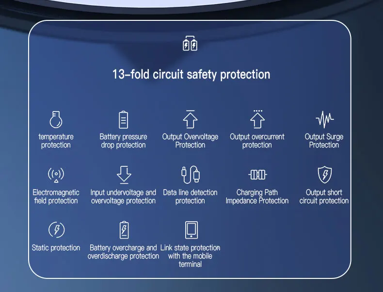 Layers of protection, safe use will not hurt the machine, escort your mobile phone. Temperature protection, input and output overvoltage protection, battery short circuit protection, etc.