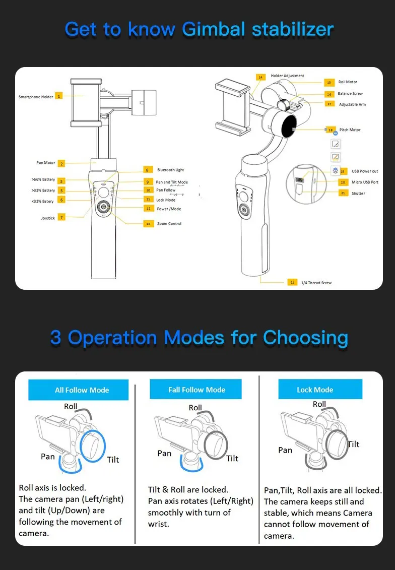 1, Stabilizer has 3 different modes: full-follow mode, half-follow mode, full lock mode