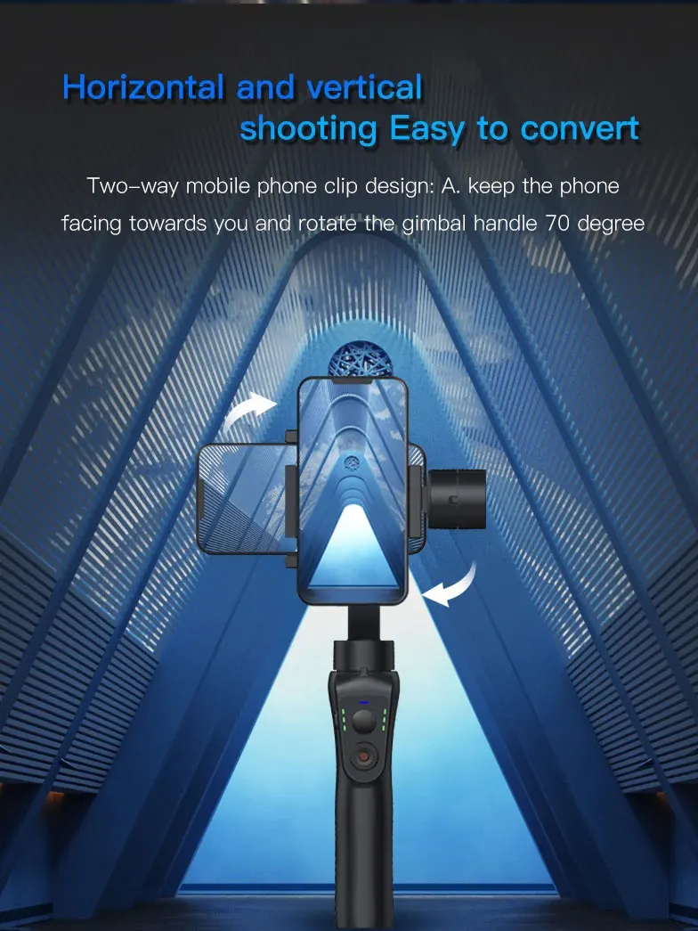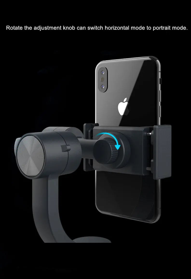 Two-way mobile phone clip design: A. keep the phone facing towards you and rotate the gimbal handle 70 degree