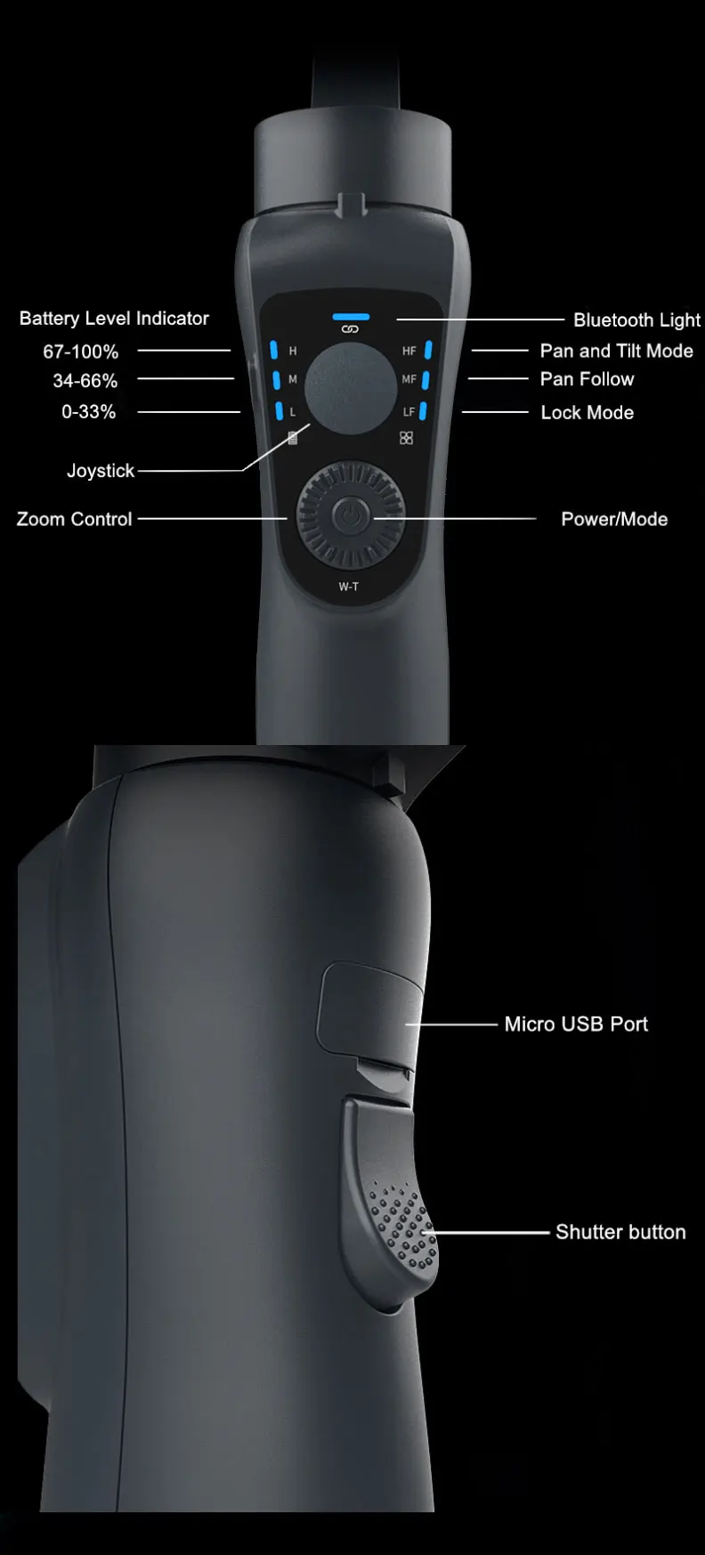 Connect Micro USB Port on the side of stabilizer's handle to a power source