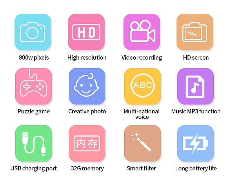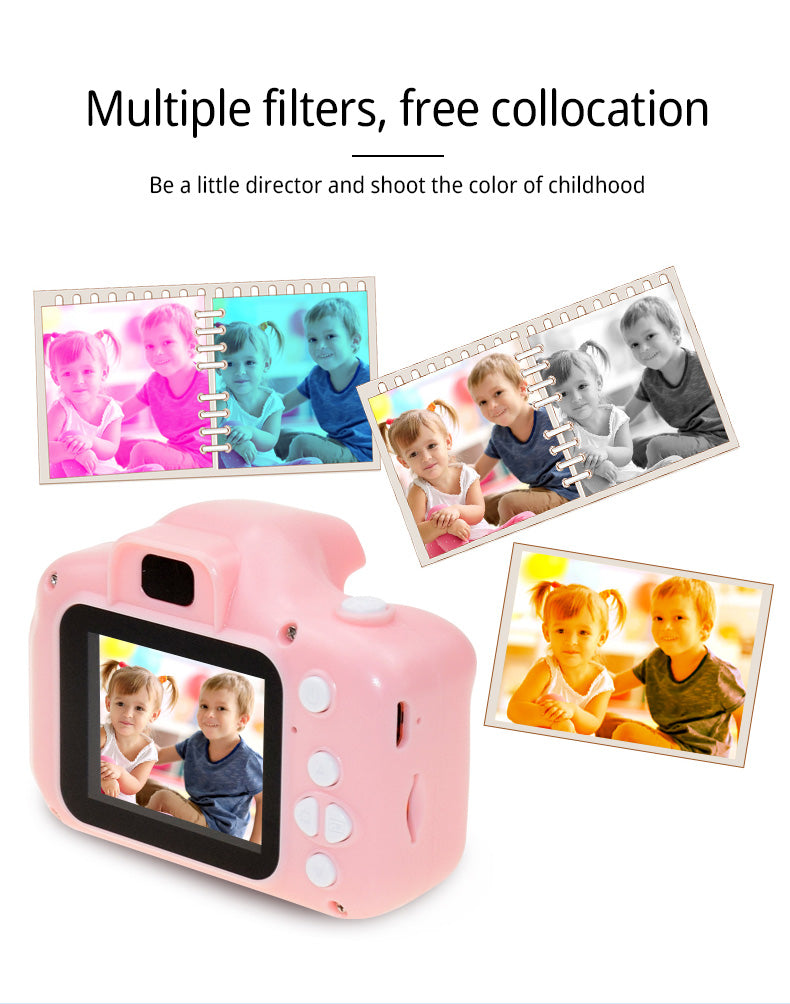 Bullet Points:1.【Hold Kids' Long-term Attention】 The toy camera has multiple functions: Kids can take photos, make digital voice recordings, videos and play games. 5 different filter effects, 15 built-in photo frame effects making the most of their creativity with intuitive sound for keeping kids engaged.