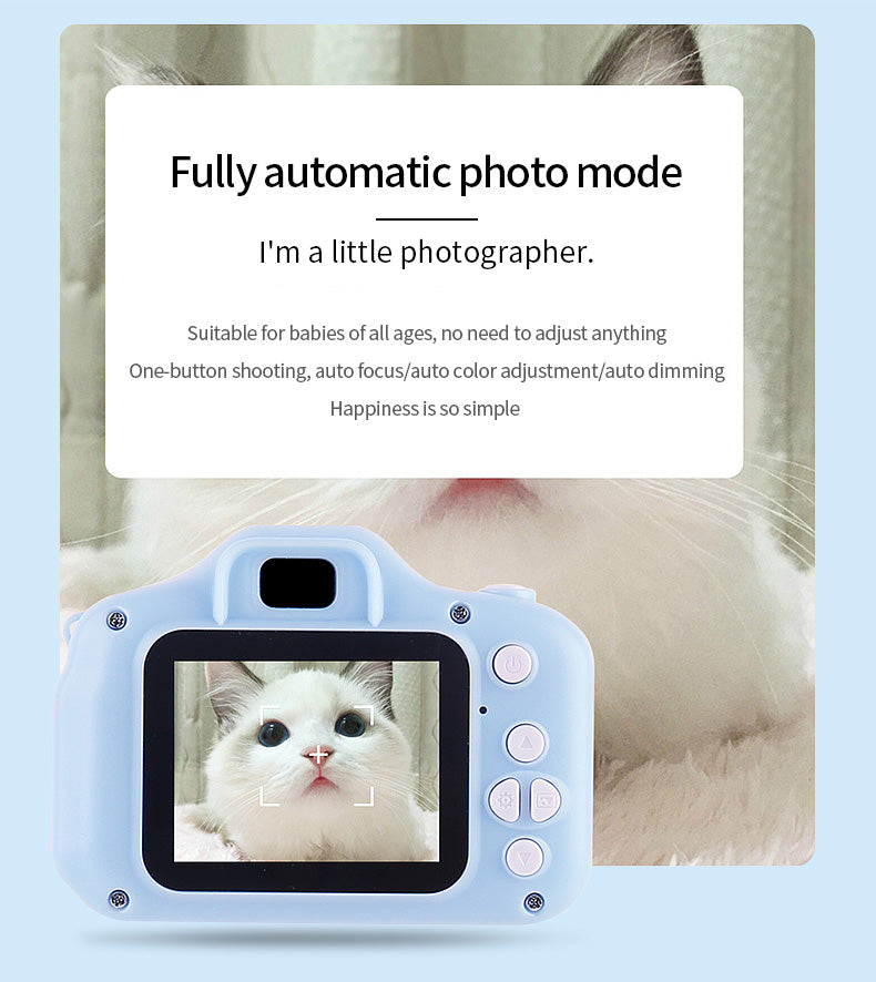 Specifications: Color: Light Blue, Pink Screen size: 2 inch Photo resolution: 1280*720 pixels Suitable for 3 years old and above Video resolution: 640*480 pixels Charging time: about 2 hours Battery capacity: 600 mAh Memory card: Maximum support 32GB (not included in the shipment) Product features: photo, video Product size: 82*57*20mm/3.23*2.24*0.79in Notes: Please allow 1-3mm differs due to manual measurement. Due to the different display and different light, the picture may not show the actual color of the item. Thanks for your understanding. ![]() 1 X Children Camera