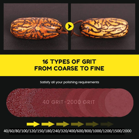 This sanding disc assortment including 16 types of grit, covers all your needs from scratch/ rust removing, sanding, polishing, fine grinding, buffing, etc.