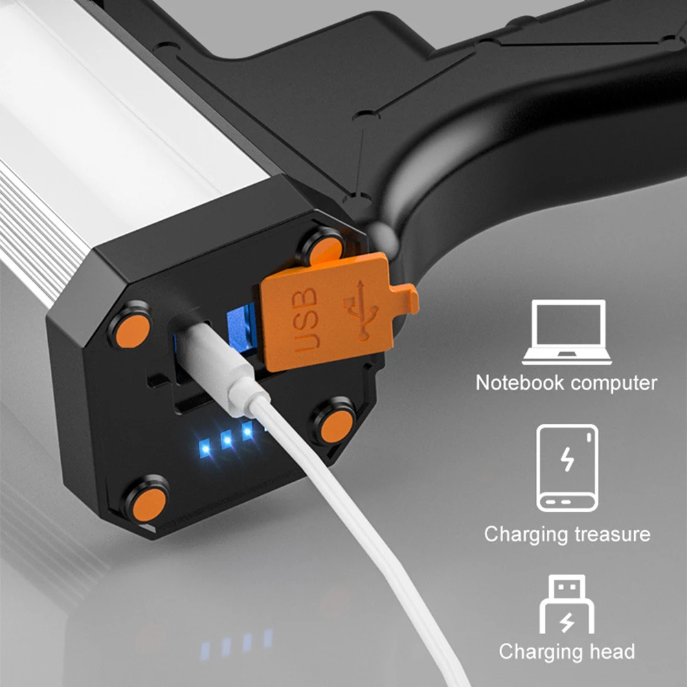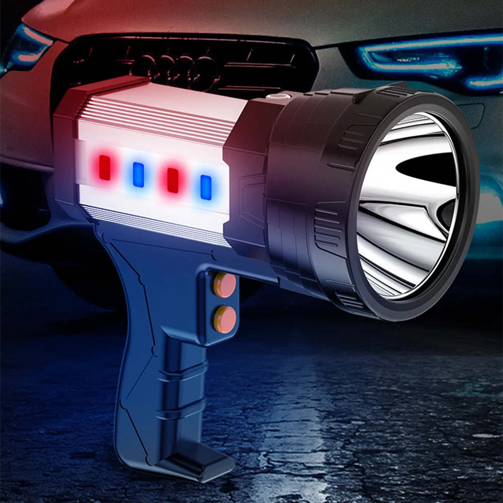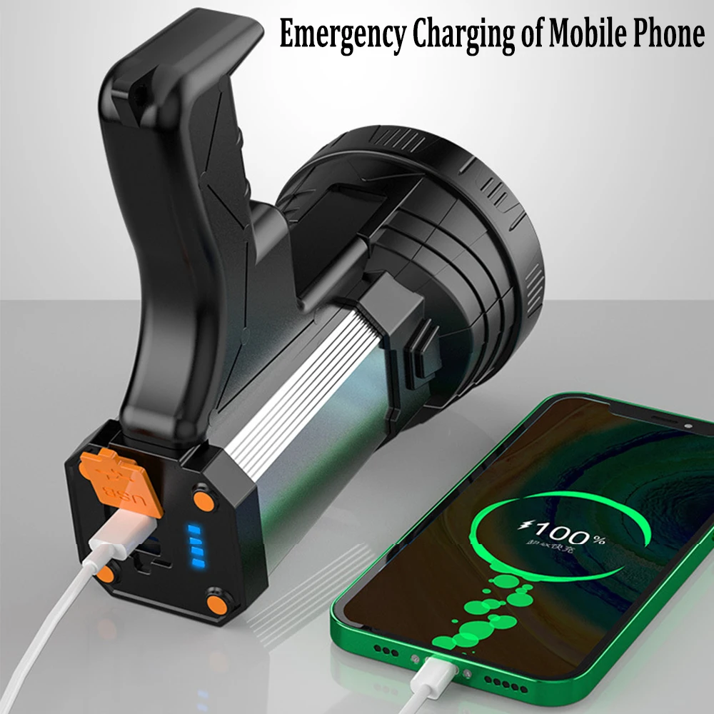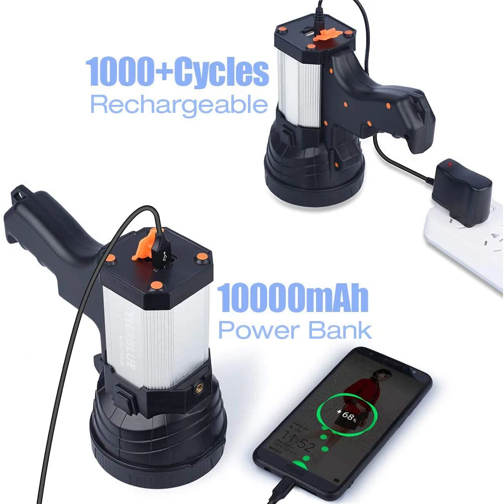 Extended battery life: Stop searching for batteries that are never there when you need them. Our big flashlight features 3 long-lasting, built-in rechargeable 18650 lithium-ion batteries(10000mAh), which can be recharged over 1000 times. And our emergency spotlight can also serve as a power bank for smartphone or mobile devices in emergency, bringing you much convenience to your outdoor travel.