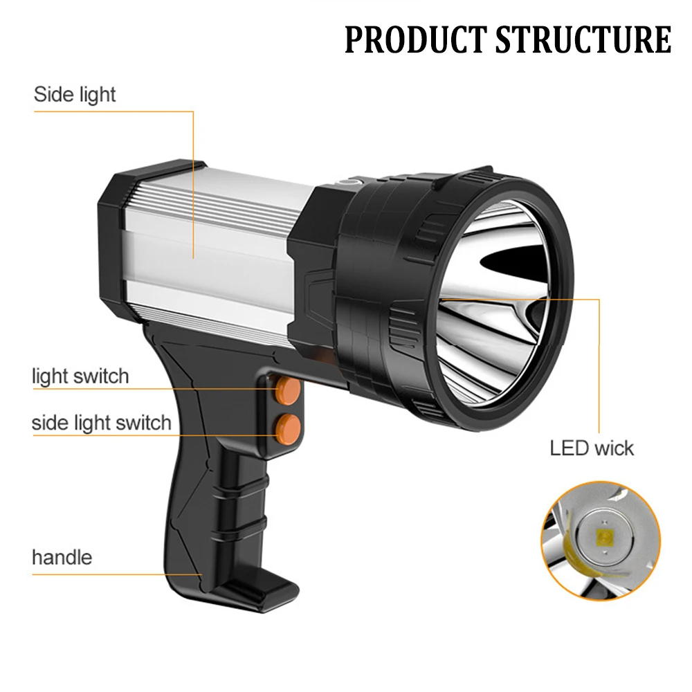No need to endlessly pay for batteries. This Updated handheld spotlight is made with a long-lasting, rechargeable 18650 Lithium-Ion battery(10000mAh). It can be recharged over 1000 times.