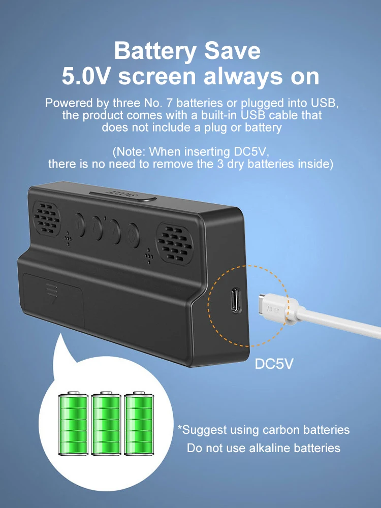 2.Two power supply methods, the light is always on when plugged in, and the sound is on when the battery is installed (the product does not have a battery).