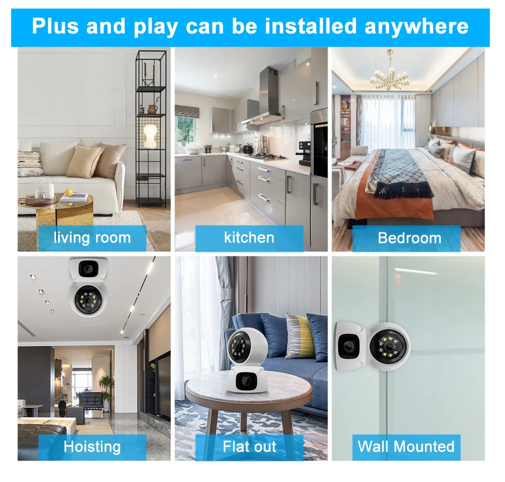 - One lens can be rotated up and down, left and right, and played in real time. One lens is a fixed shot of the corresponding area monitoring screen. One screen can view real-time images of two lenses at the same time