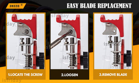 It can also be easily replaced by your locally available blade. The blade can be removed in three easy steps: 1. Locate the screw; 2. Loosen; 3. Remove blade