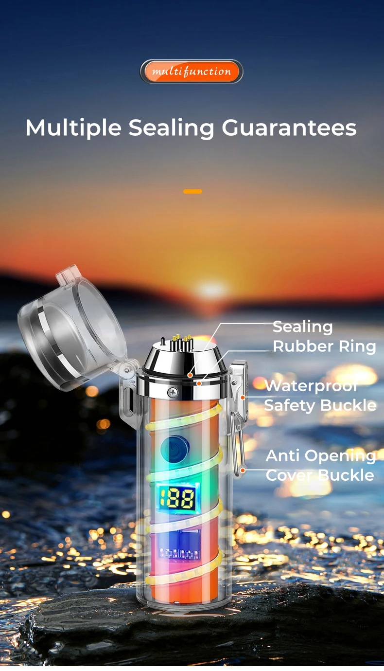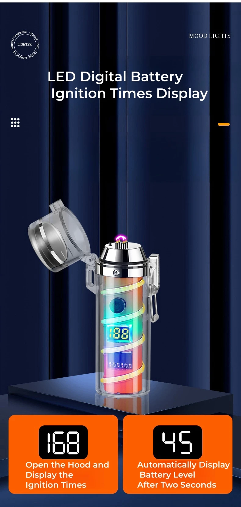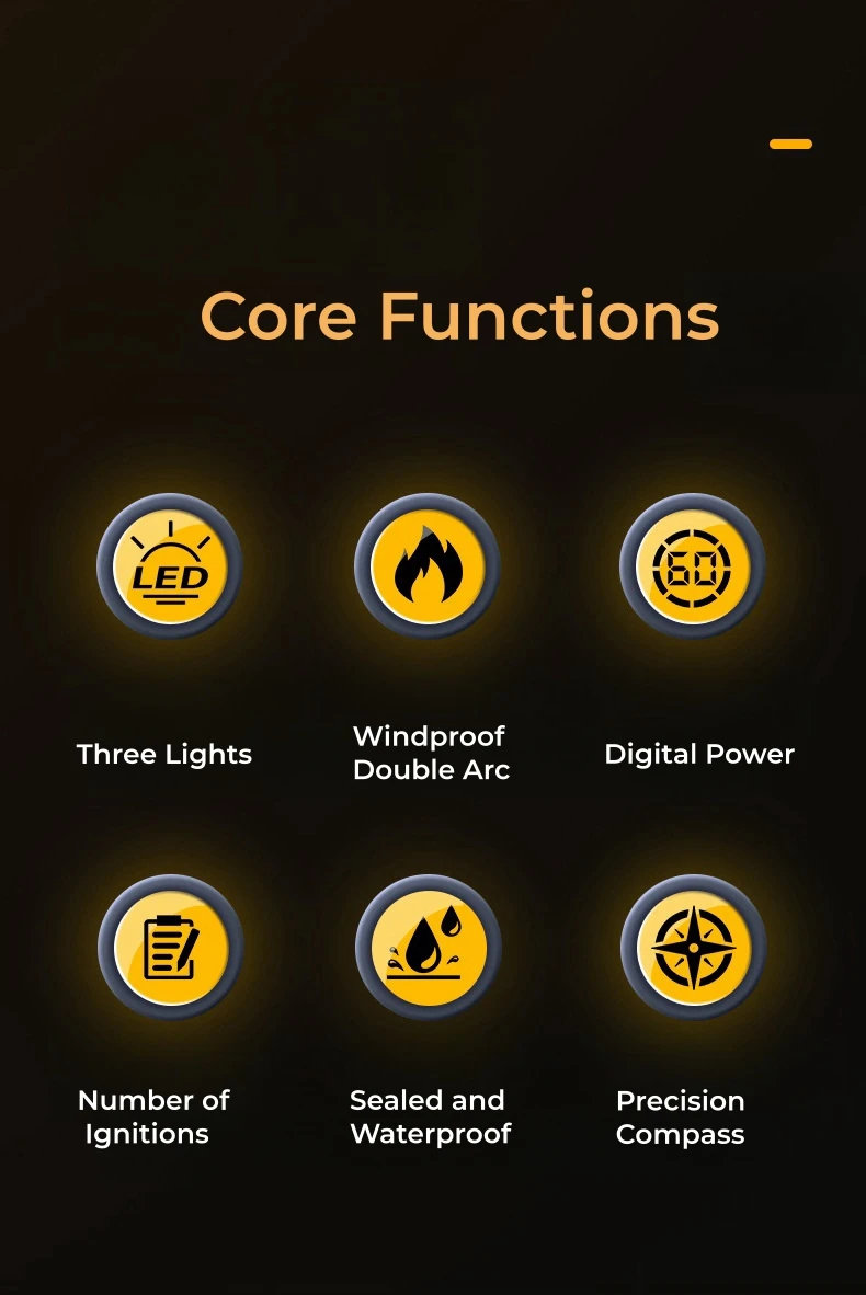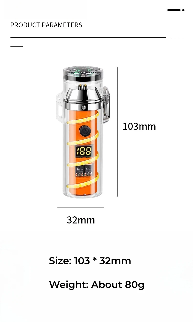 Functions: three-speed lighting mode, windproof double arc, digital power display, ignition times display, sealed waterproof, accurate compass.