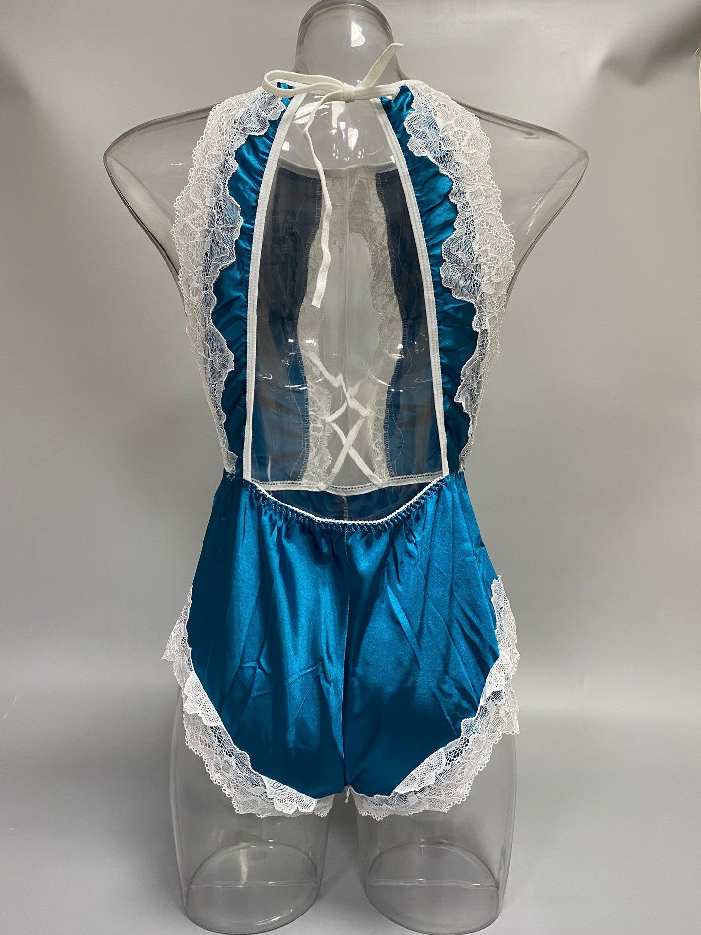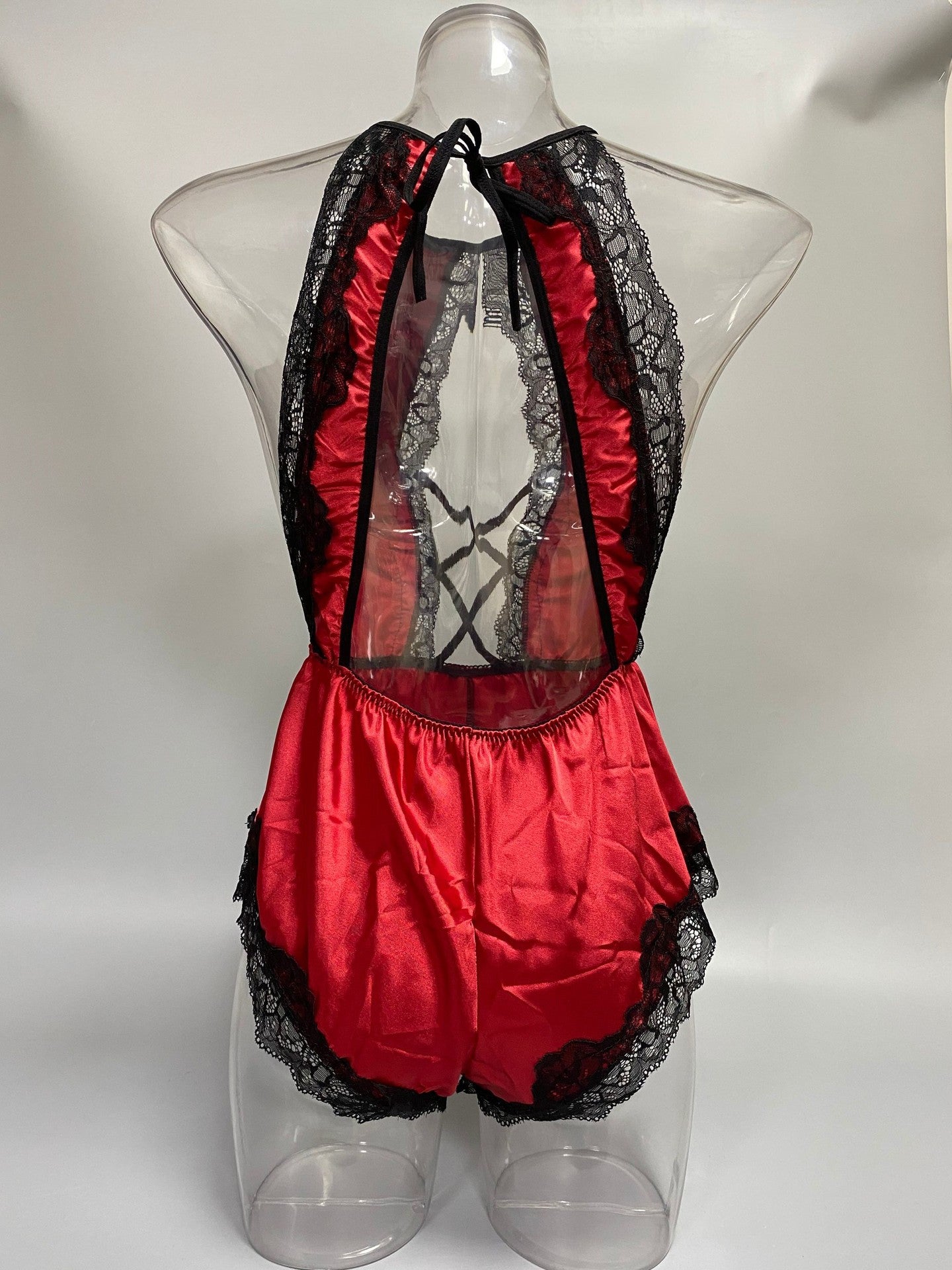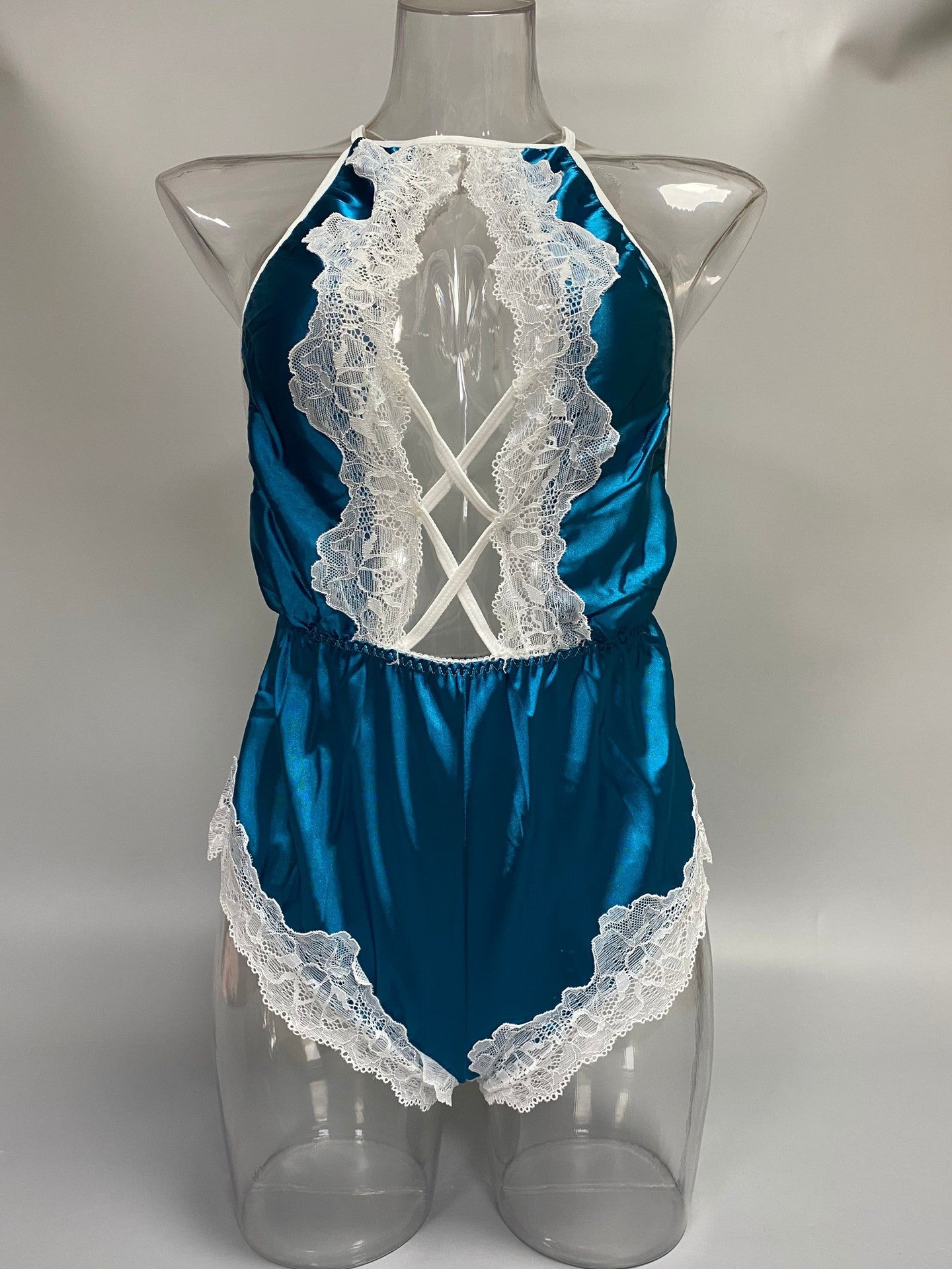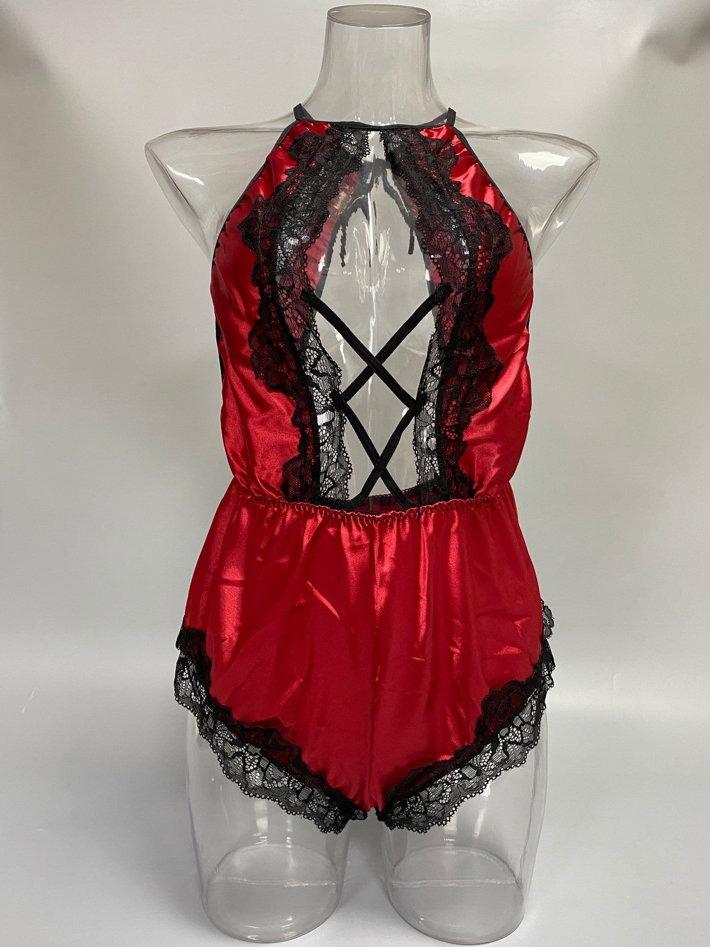 Style: Sexy One Piece Open Back Lingerie Bodysuit ,Low Cut V-Neck One Piece Pajama, Cropped One PieceSexy Satin Lingerie, Women's Satin Pajama, Scalloped Lace V Neck Cutout Trim, Tie Back Open Back