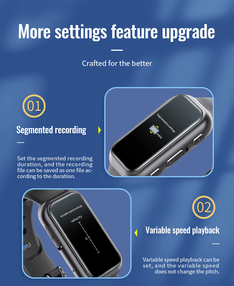 1. Sound activation recording: When the sound is greater than 30 decibels, the recorder starts recording. When the sound is less than 30 decibels, the recorder stops recording, helping users save power and memory. Sound activation recording.