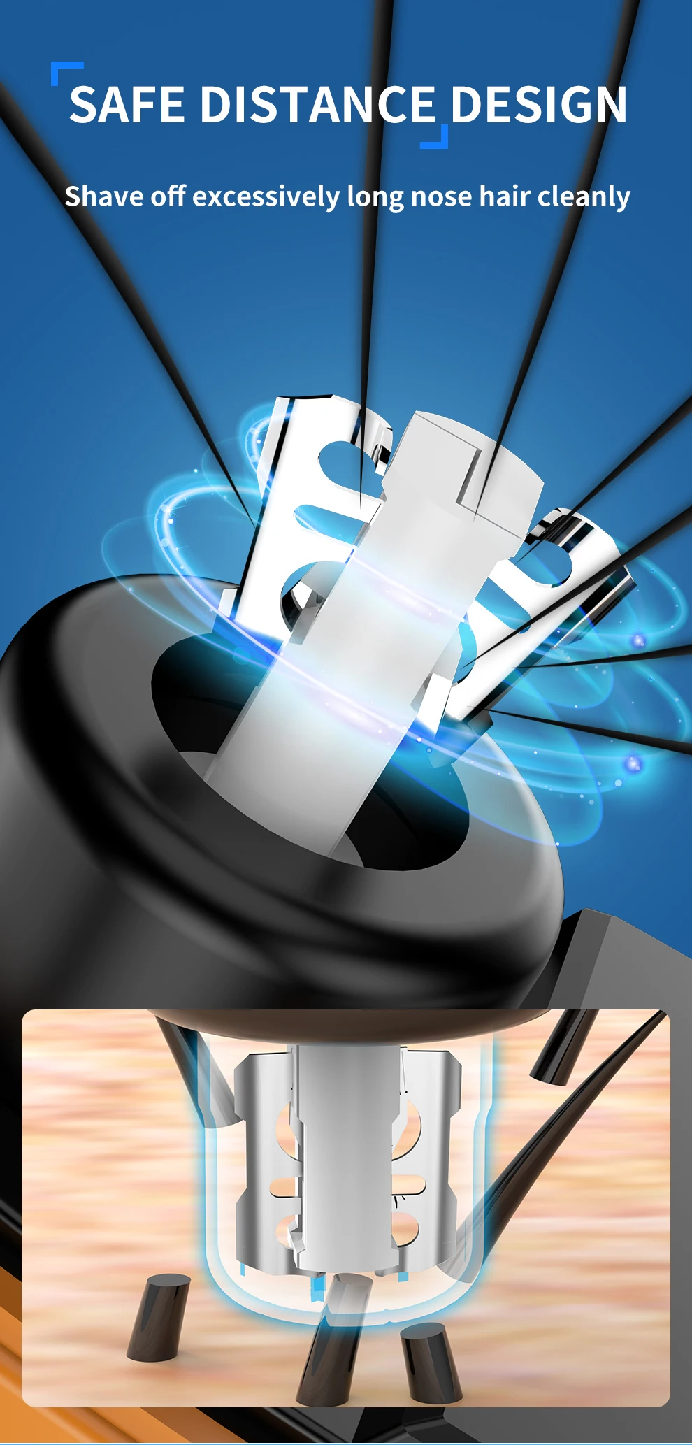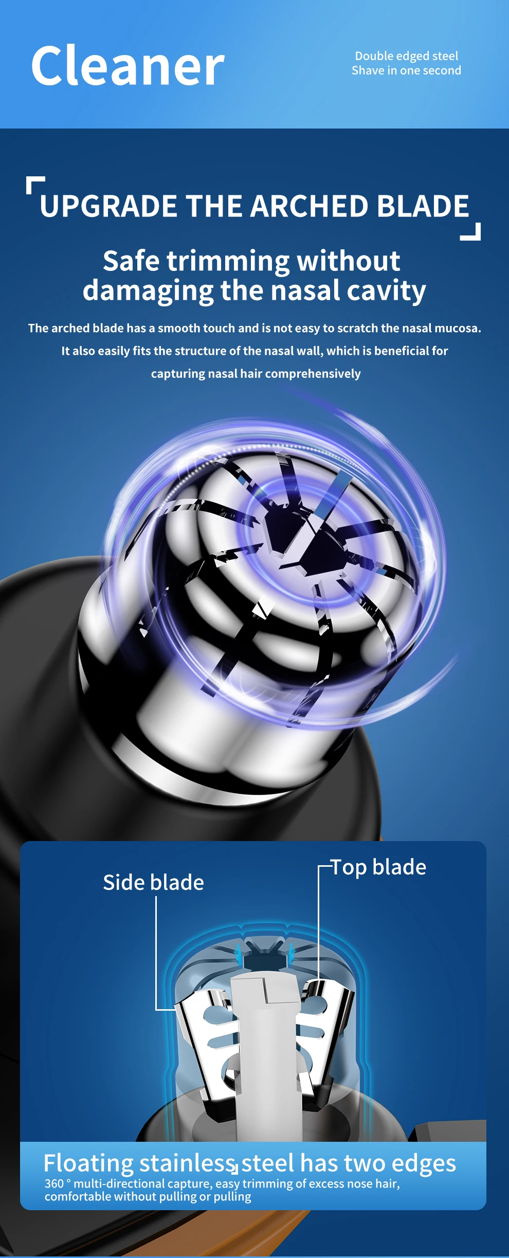 *   Features a 360° rotating rounded blade head that reaches deep into the nostrils to precisely capture and cut nose hair, eliminating pulling pain and gently caring for delicate nasal mucosa.