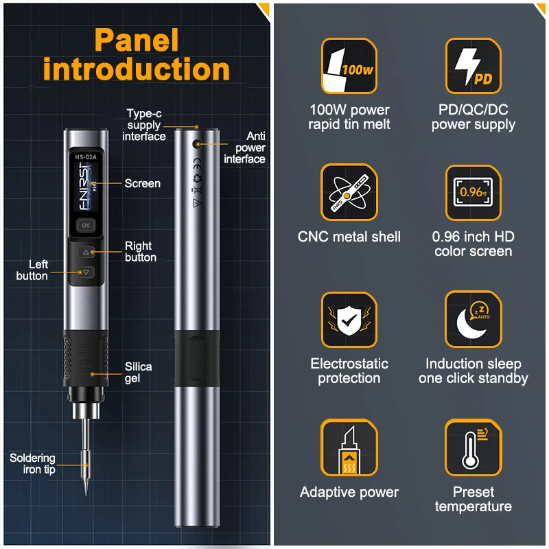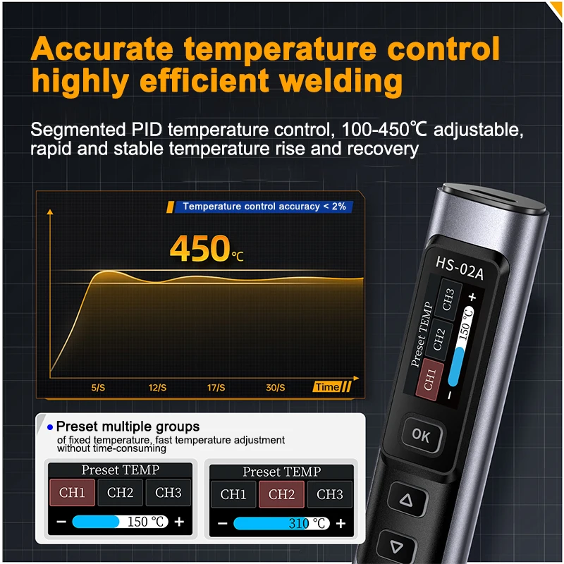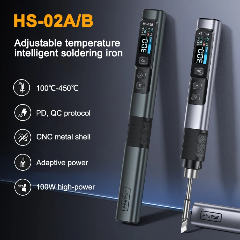 HS-02 is a portable screen display intelligent soldering iron launched by our company. This soldering iron has the following characteristics: