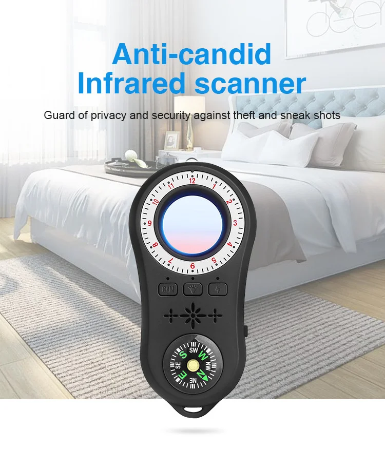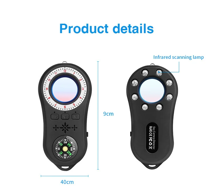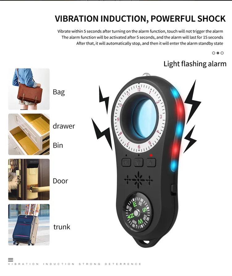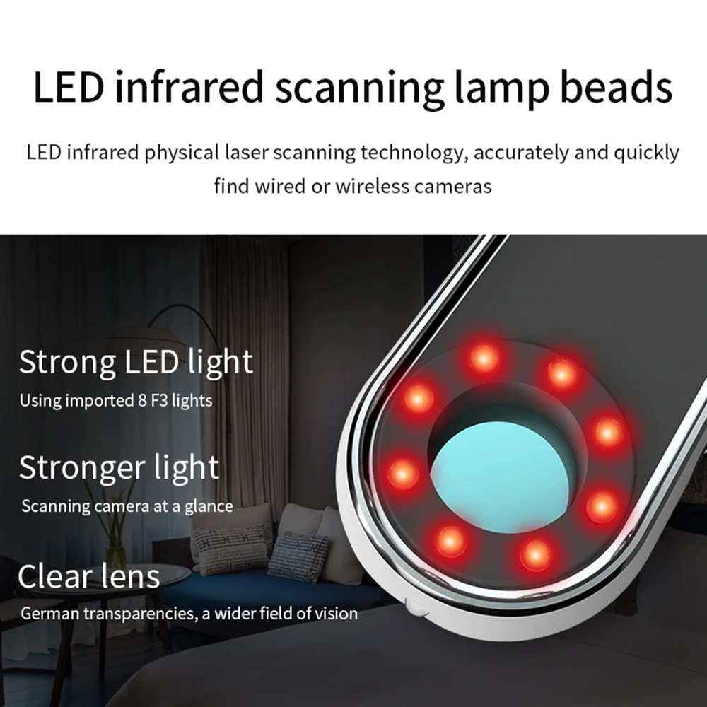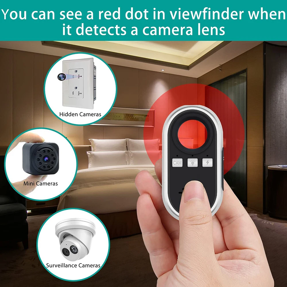 3.Easy to Carry: The design of the camera detector is humanized, which alerts you with indicator light, vibration or beep when the suspicious RF wireless signal or magnetic field signal is detected. The special infrared lens and LED infrared lamp will help you scan the invisible wired or wireless camera. The sensitivity can be adjusted to meet the detection range. It's lightweight, portable size, and easy to carry.