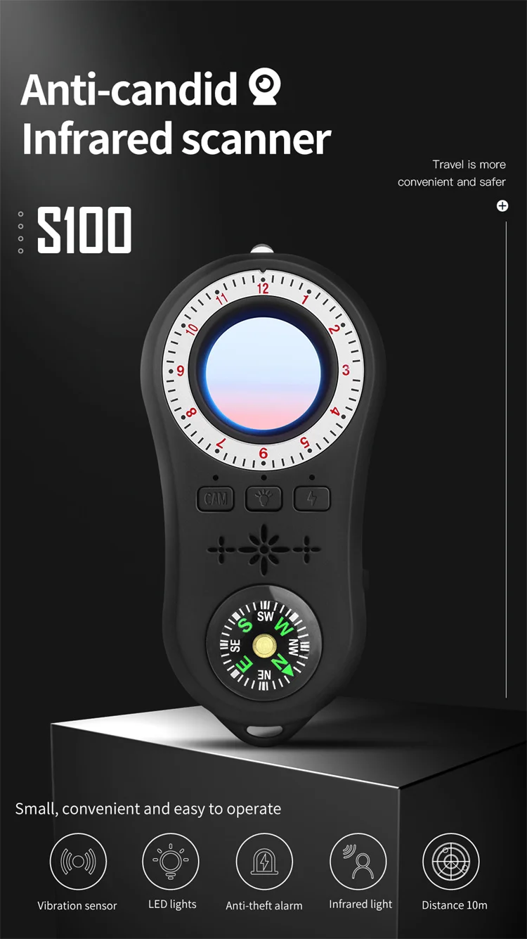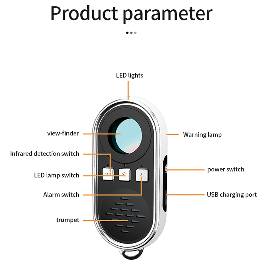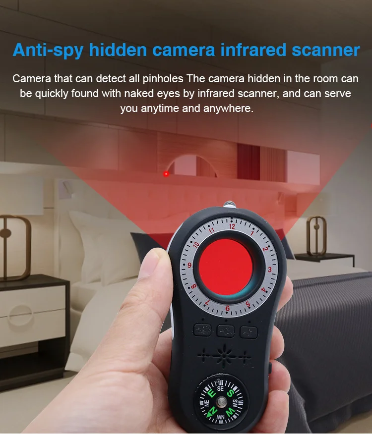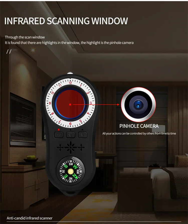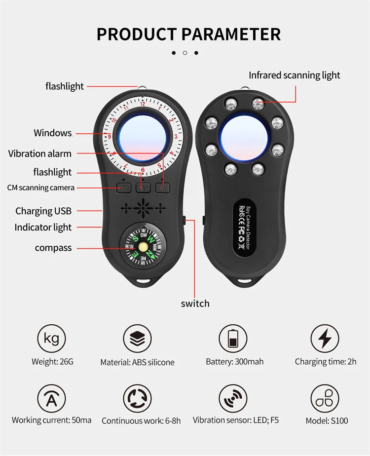3.Easy to Carry: The design of the camera detector is humanized, which alerts you with indicator light, vibration or beep when the suspicious RF wireless signal or magnetic field signal is detected. The special infrared lens and LED infrared lamp will help you scan the invisible wired or wireless camera. The sensitivity can be adjusted to meet the detection range. It's lightweight, portable size, and easy to carry.