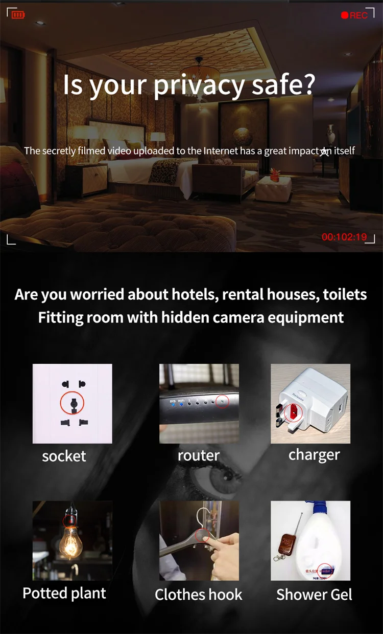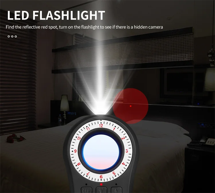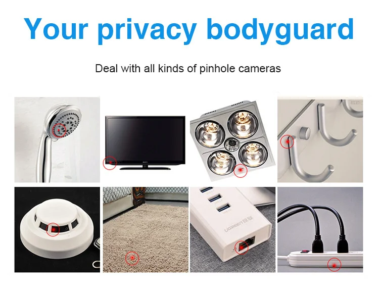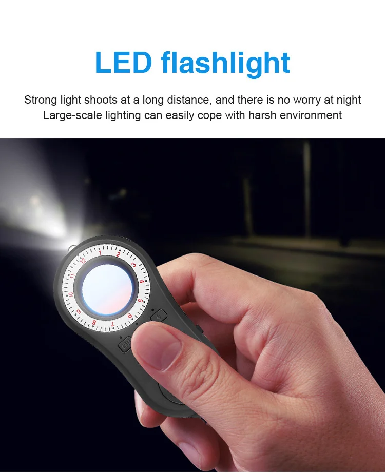 1.High Sensitivity: The signal detector adopted the advanced smart chip, and it is more delicate and you can find the exact suspicious device at a fixed point by adjusting the sensitivity intensity and a wide detection range (1MHz-6.5GHz). This camera detector is a perfect defender to protect your privacy.This detector device can be use for home, hotel, car, bathroom, toilet etc.