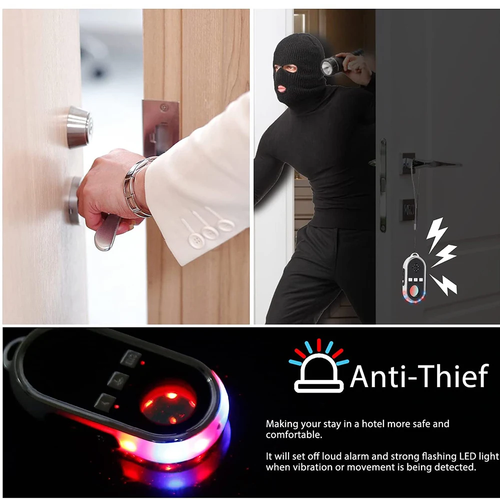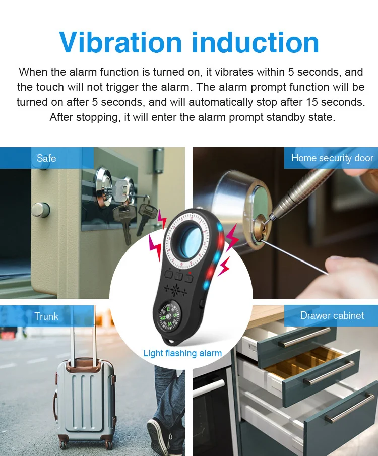 Press the alarm button to activate the thief alarm to hang the device on a valuable suitcase or door with a mobile or vibrating device flashing red and blue alarms, and then press to close.