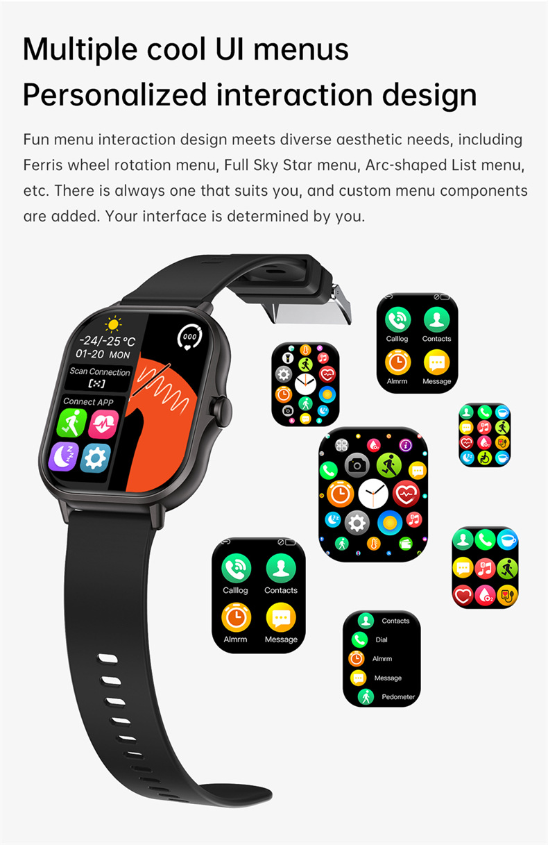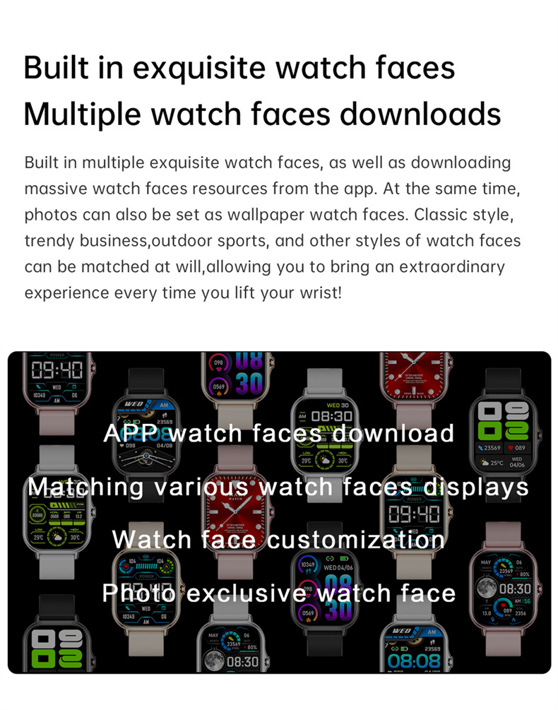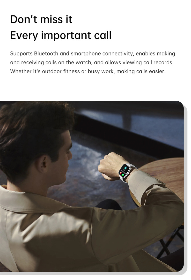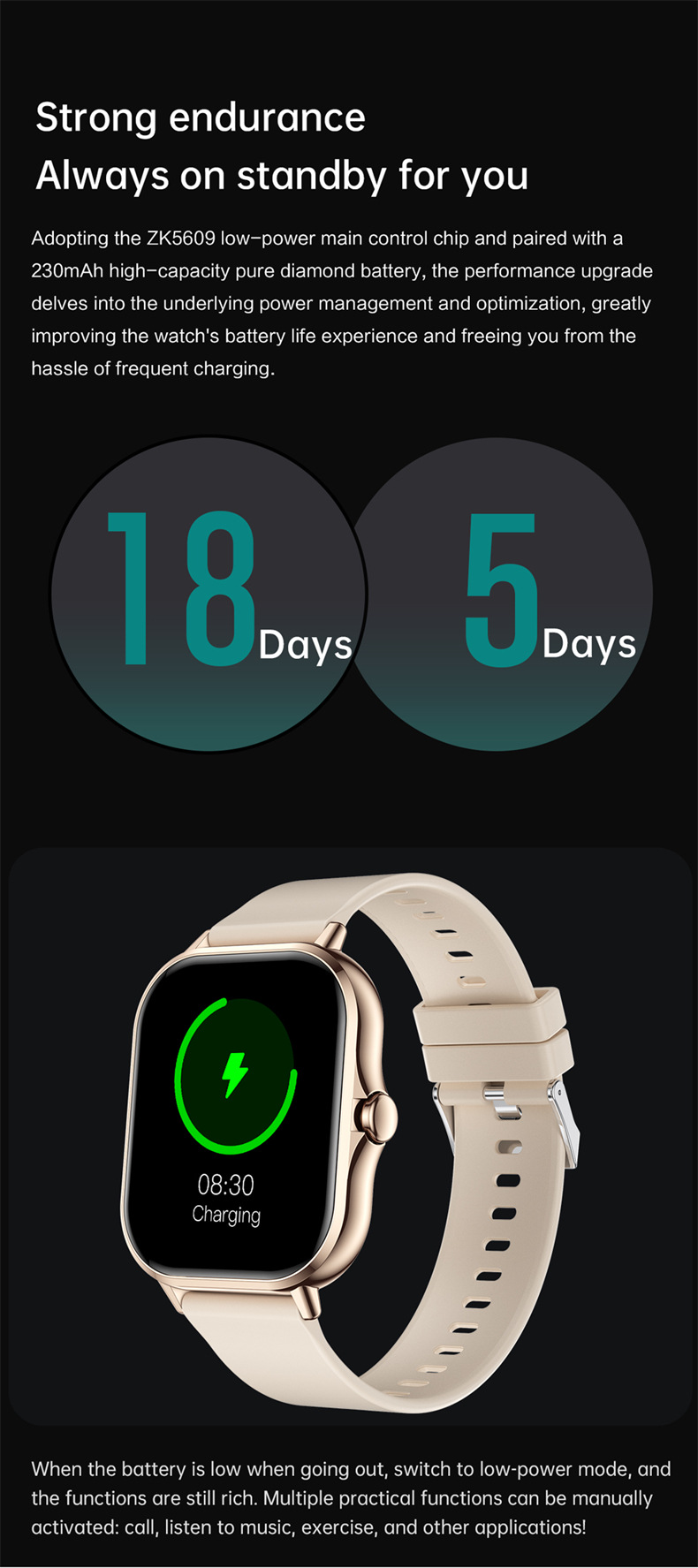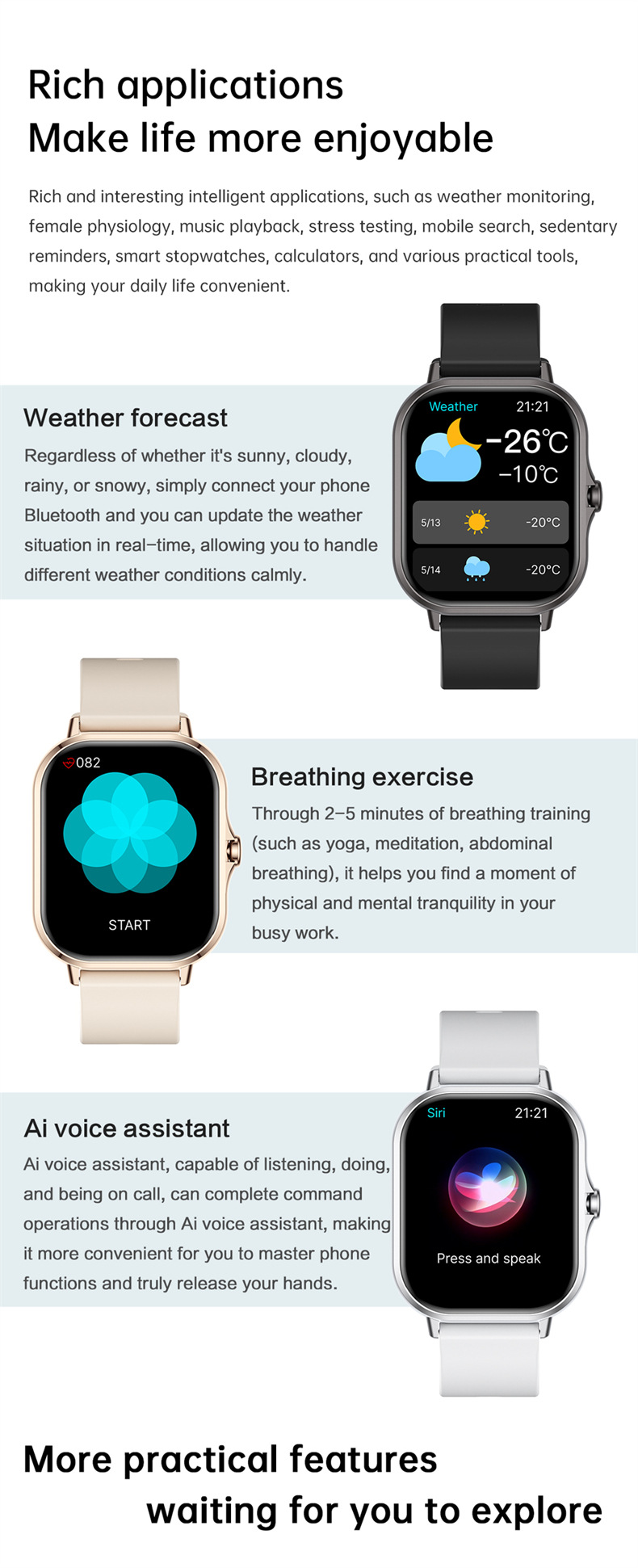 Daily Smart Features: Bluetooth call, voice assistant, weather forecast, alarm clock, timer, stopwatch, calendar, calculator, remote control photography, music control, find phone/find watch, do not disturb mode.