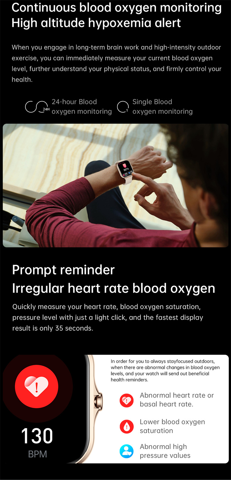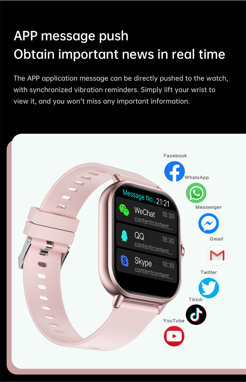 Daily smart reminder: Sedentary reminder, SMS notification, incoming call, drink water, medication reminder, , female cycle reminder, heart rate warning reminder, low battery reminder, goal achievement reminder.