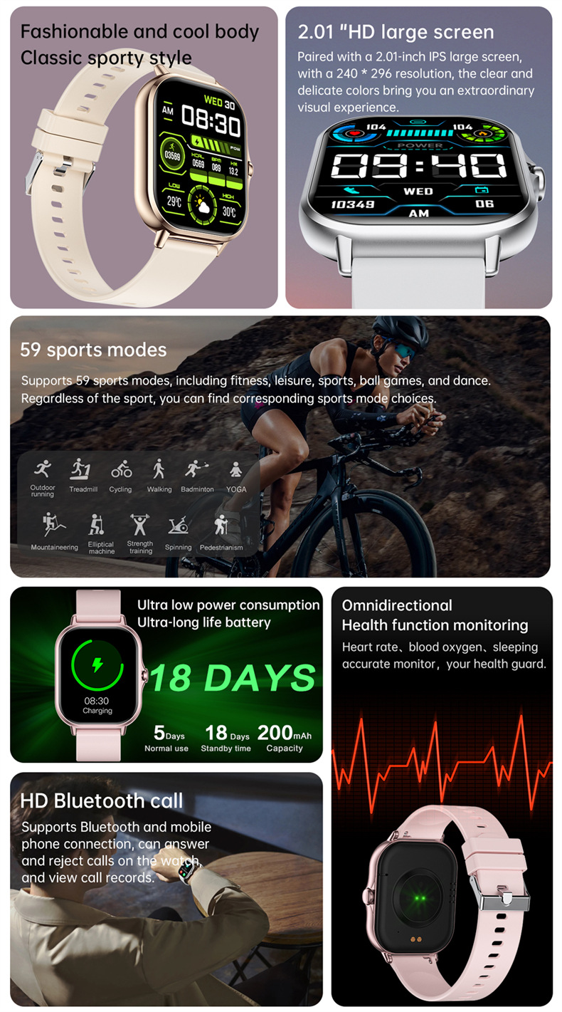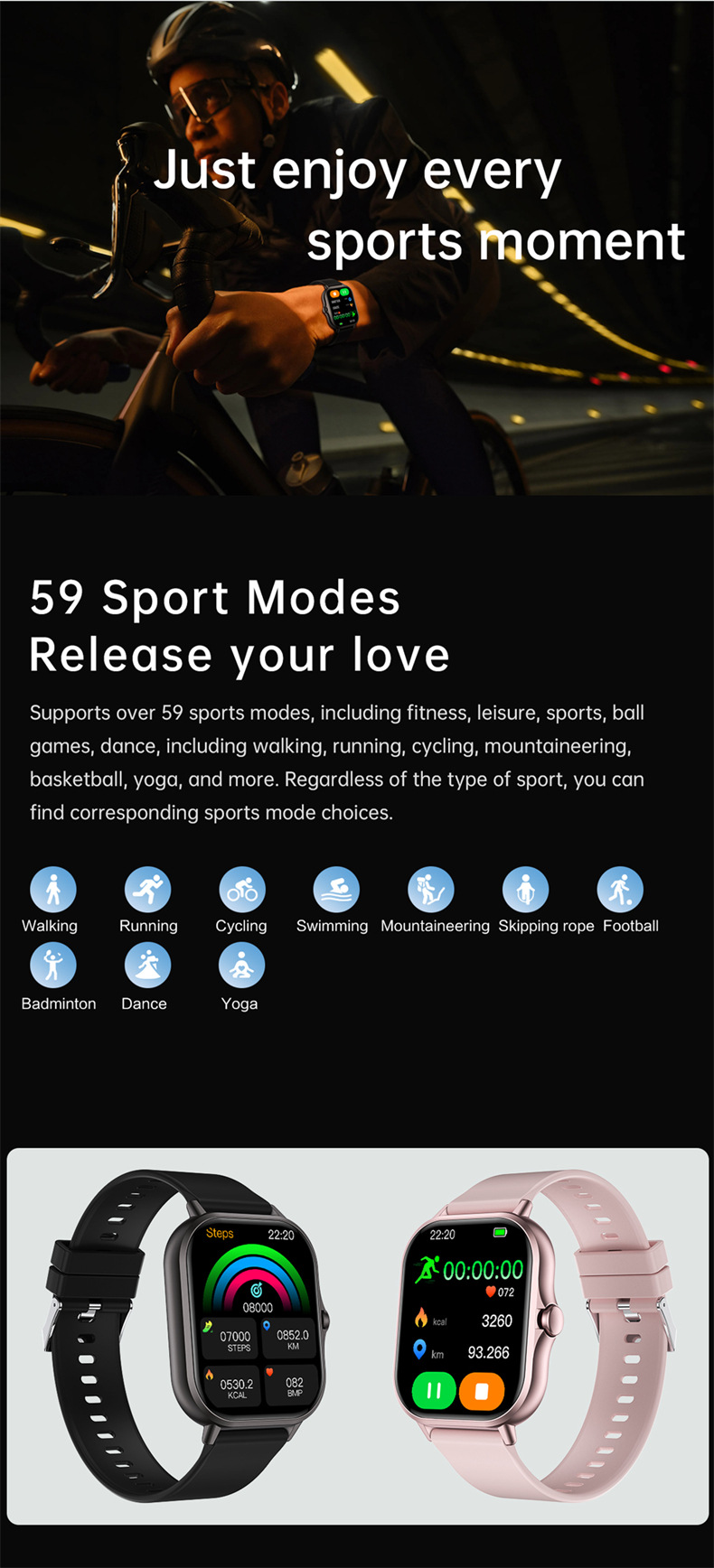 Sport Modes: (100+ Sport Modes) Running, treadmill, outdoor sports, cycling, swimming, walking, mountain climbing, yoga, spinning, basketball, football, badminton, marathon, indoor walking, free exercise, strength training, weightlifting, boxing, skipping, stair climbing, skiing , skating, roller skating, hula hoop, golf, baseball, dance, table tennis, hockey…