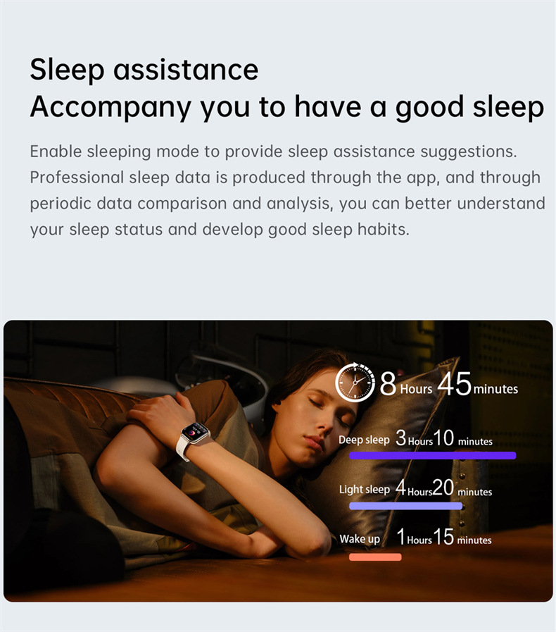 Health monitoring: Heart rate monitoring, sleep monitoring, calorie monitoring, blood oxygen monitoring, blood pressure monitoring, female menstrual cycle monitoring, blood pressure monitoring.