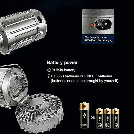 MULTIFUNCTIONAL - Camping lantern and flashlight, fan and power bank for iPhone and Android.