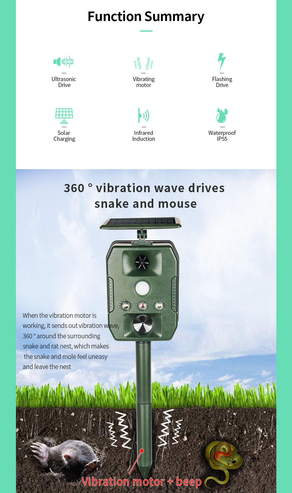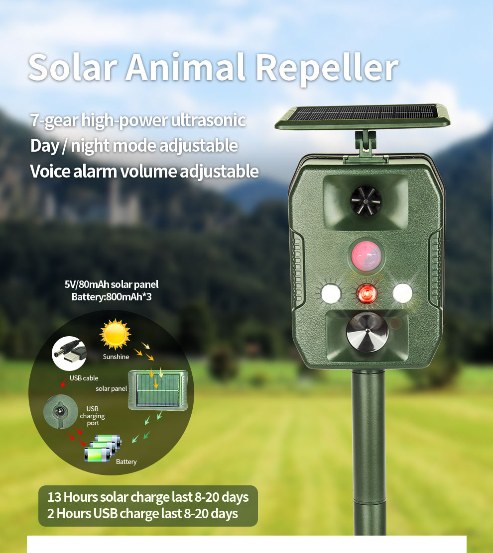 5. Wide Applications: This solar-powered repeller uses ultrasonic technology to deter pests such as rodents, dogs, cats, squirrels, wild boars, snakes and birds, making it an excellent option for residential or commercial property owners looking to protect their gardens, lawns, farms, and other areas from unwanted pests.