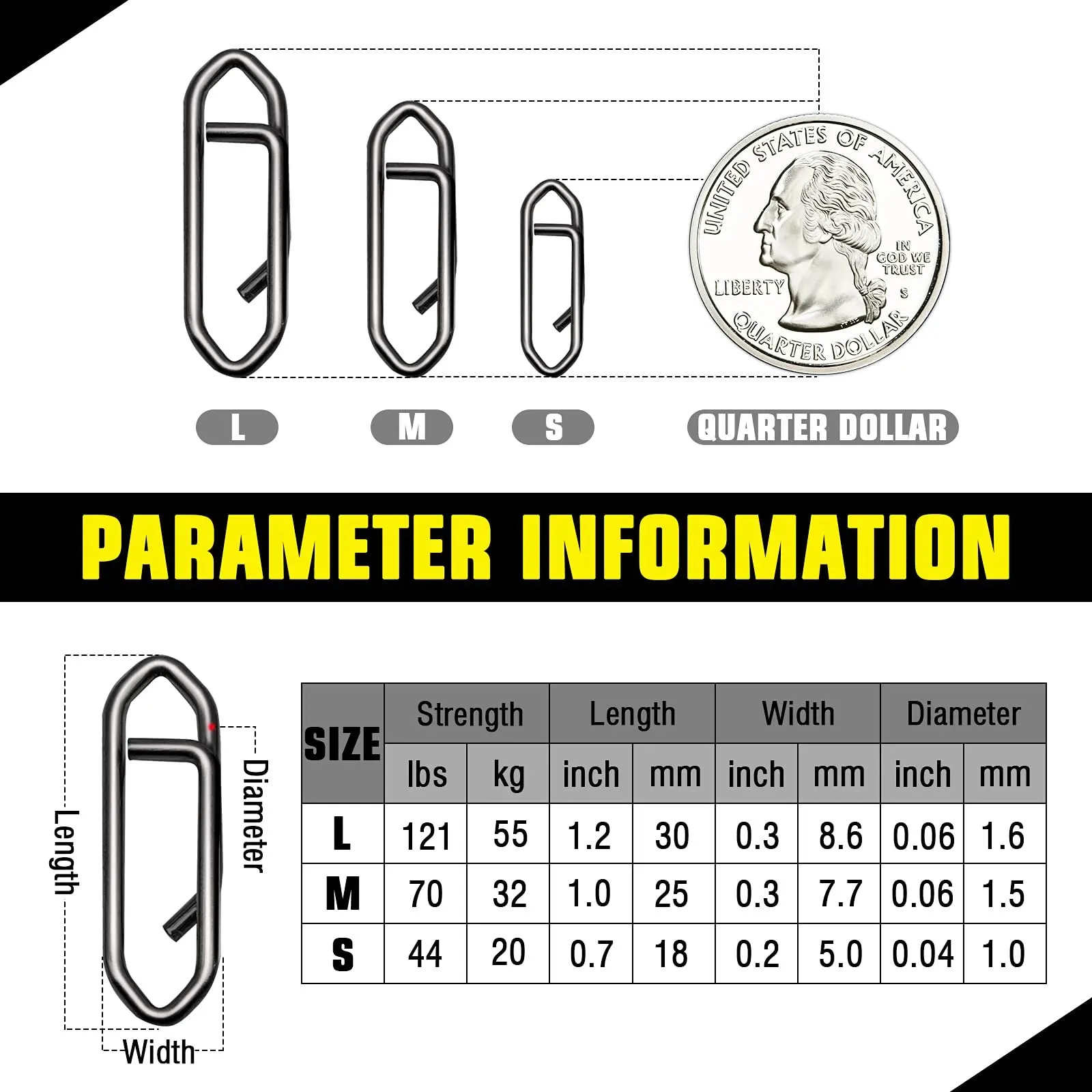 The high strength snap clip could be used for various usages.As it has the abrasion resistance rotation bearing and high strength rings,you can use it be connector for hanging. The strength of fishing swivels are different from 44lb to 121lb.The length of fishing swivels from 0.7 inches to 1.2 inches. Please confirm your suitable sizes of snap swivels before purchasing it.