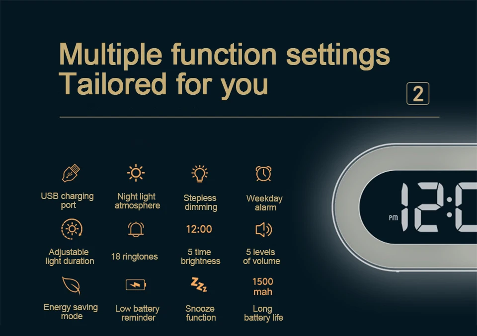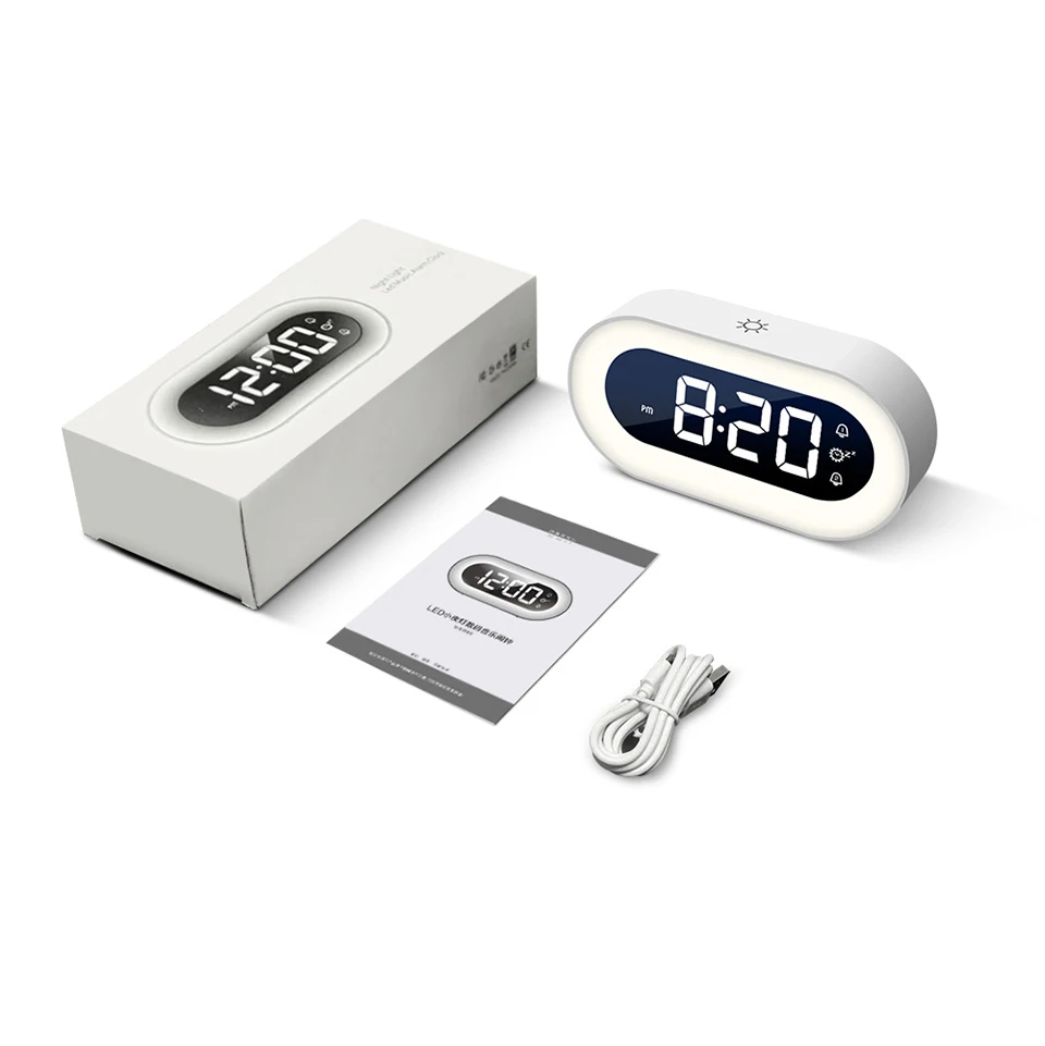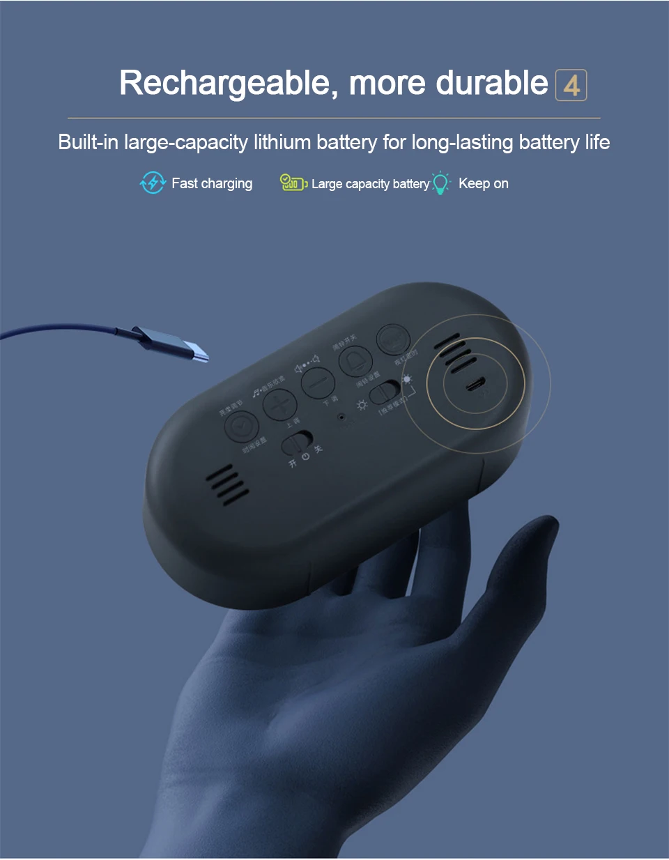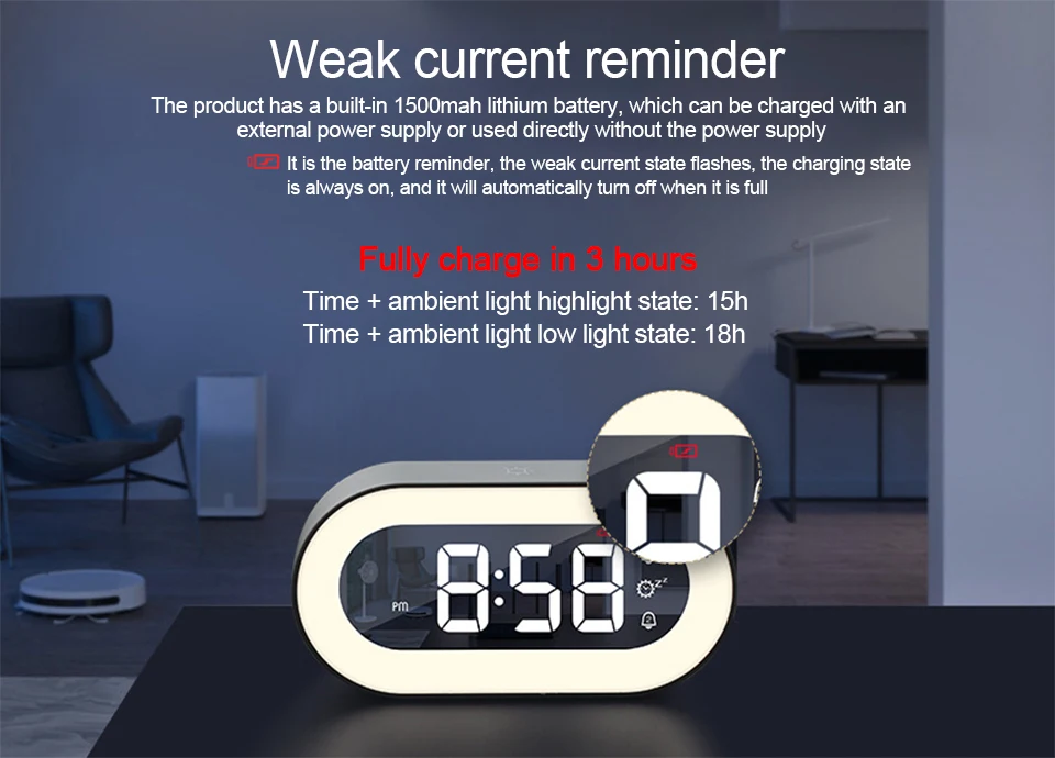 【USB Power Supply & Low Battery Reminder】Built-in 1500mah lithium battery, equipped with a one-meter long charging cable (without adapter, please use 5V 1A or 2A adapter), energy saving and environmental protection. When the low battery icon appears on the screen or flickers abnormally, please charge the alarm clock in time. The rechargeable LED light is always on and will automatically go out when fully charged.