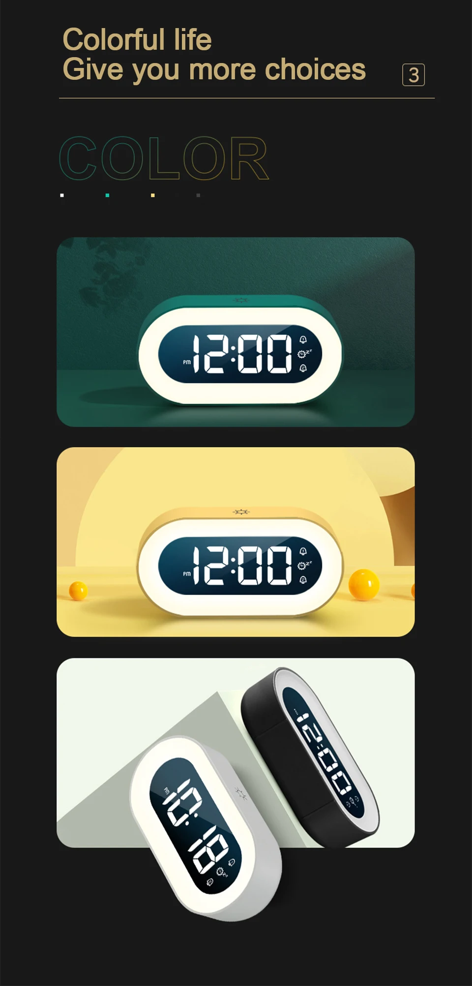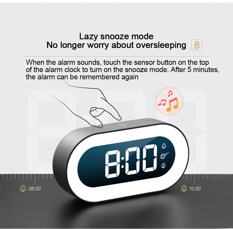 【New Night Light Design & Mirror Design】The upgraded digital alarm clock adds the design of the atmosphere light, which realizes the perfect combination of the alarm clock and the night light, supports infinite dimming, and can also be turned on and off separately. You can freely set the brightness time (5- 120 minutes), create a romantic and warm atmosphere for yourself. In addition, the mirror design makes it not only an alarm clock, but also an exquisite and compact mirror.