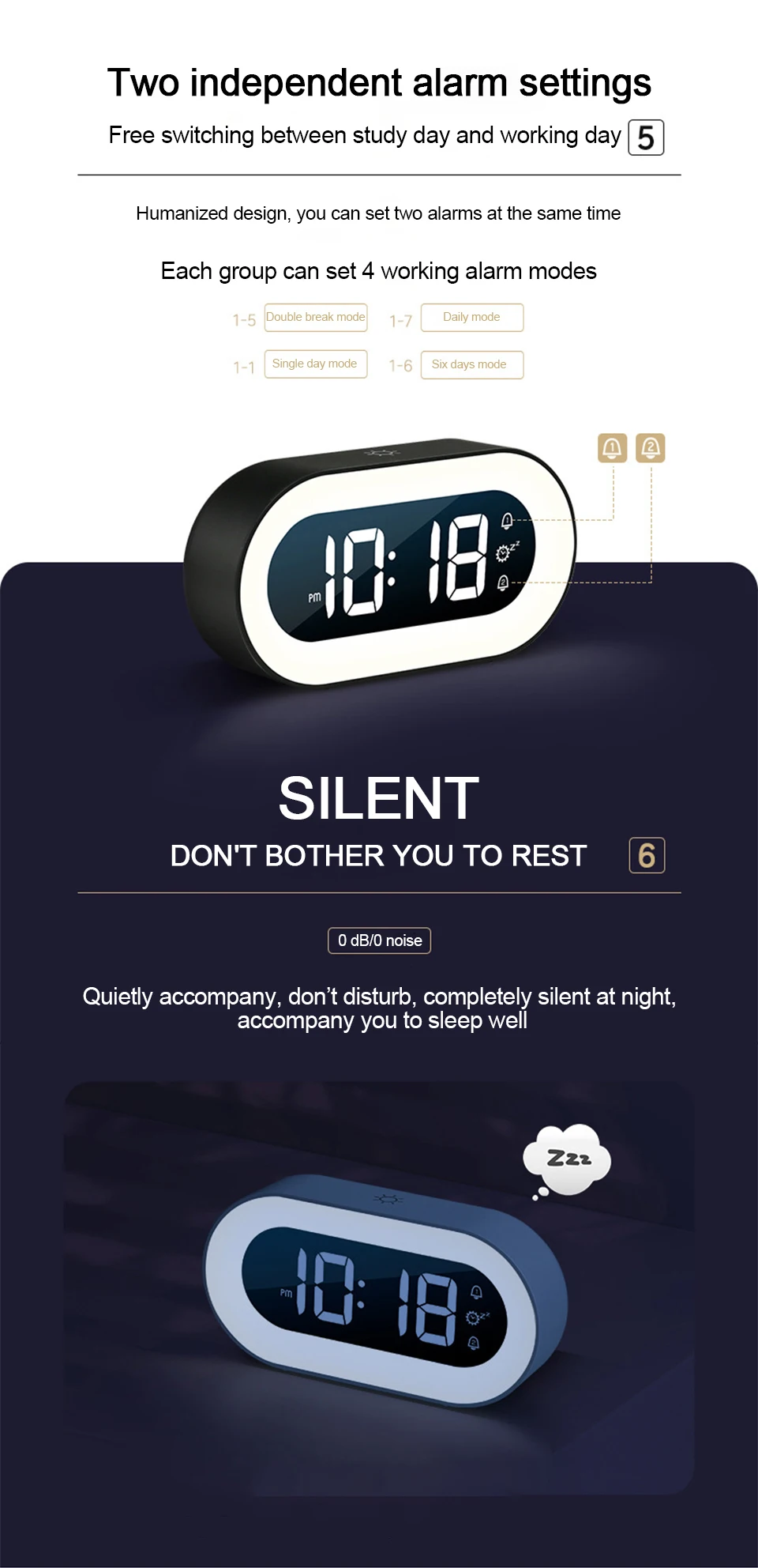 6. Support workday alarm clock and weekend alarm clock settings. Free choice of 4 modes (1-1, 1-5, 1-6, 1-7)