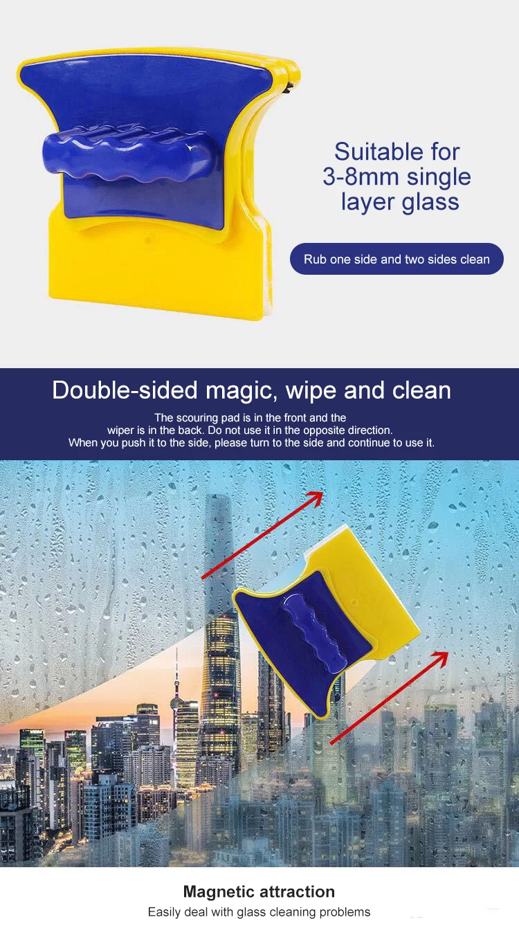 The Double-sided Magnetic Glass Cleaner is a convenient and safe cleaning helper. With the double-sided magnetic feature, by moving the cleaner indoor you can clean the outer window surface easily without putting yourself in danger.
