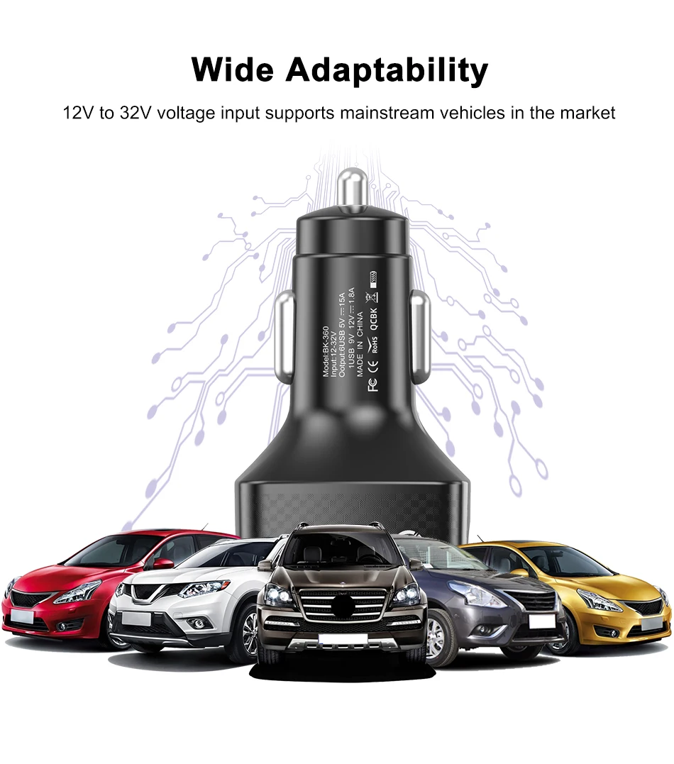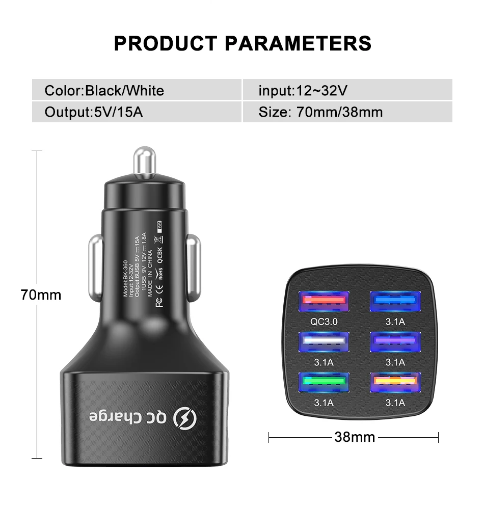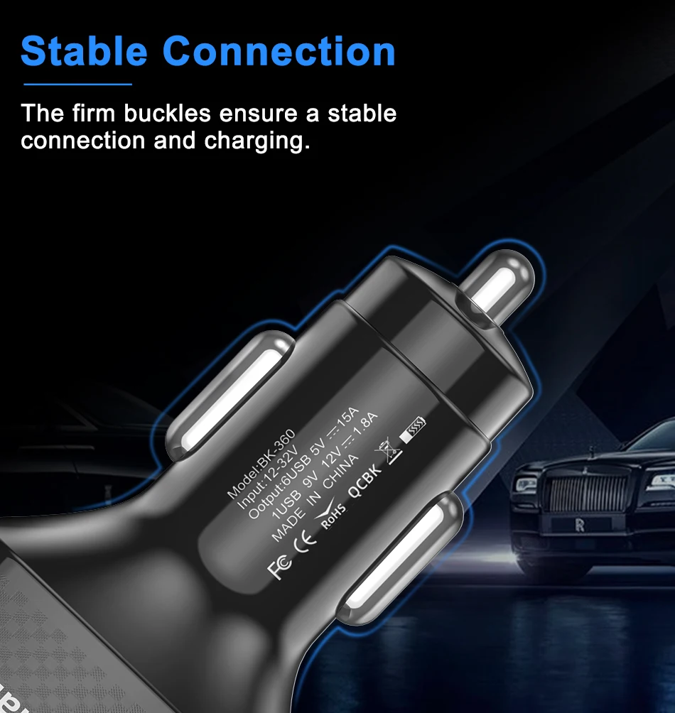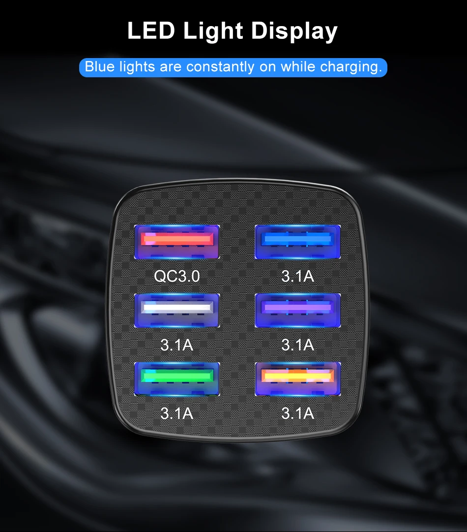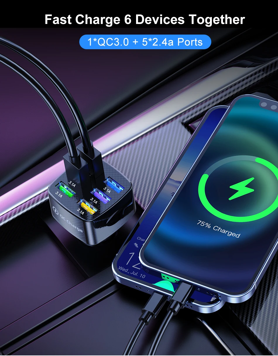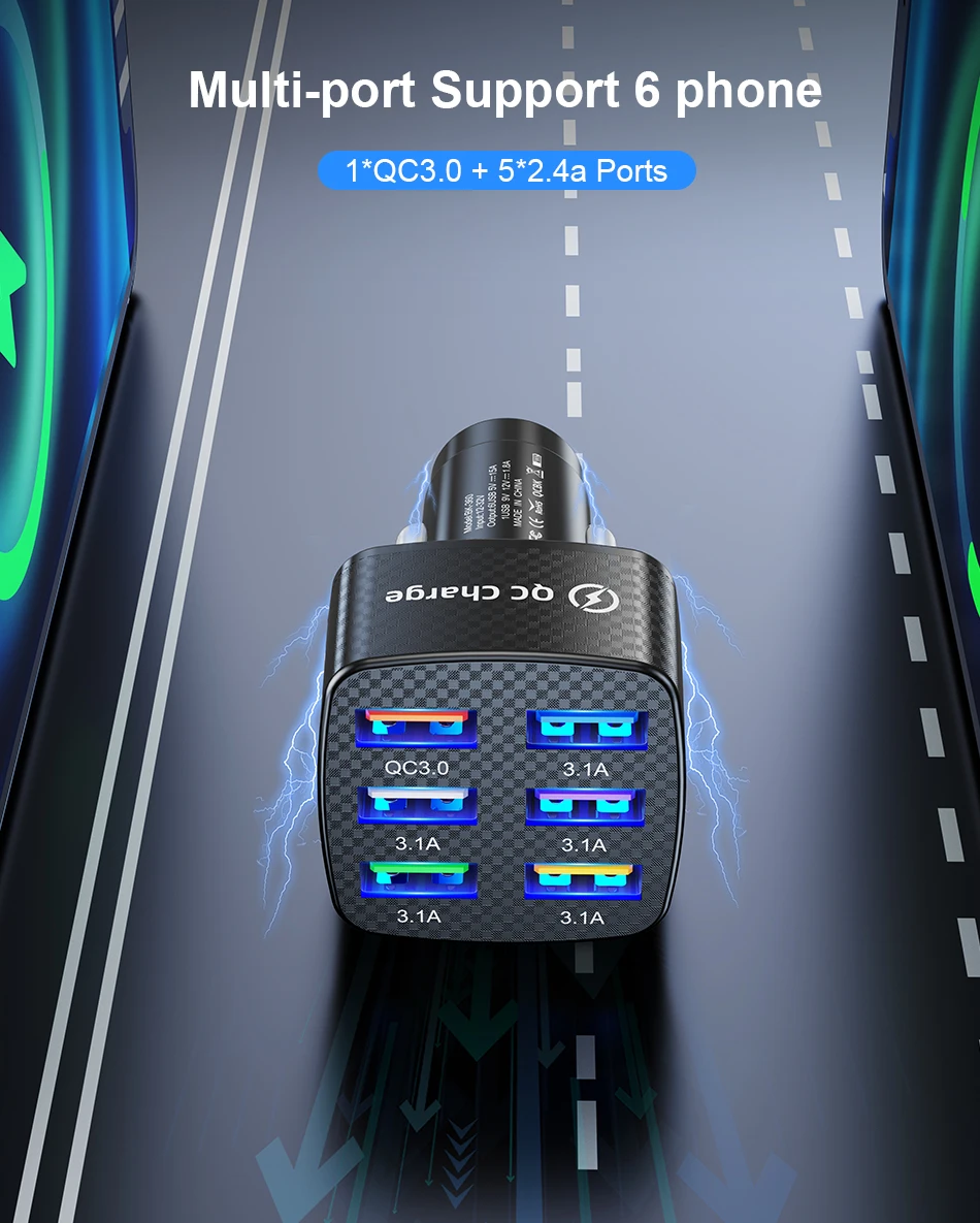 【6 Ports Mobile Phone Car Charger Support QC 3.0 and 3.1A Fast Charging】
