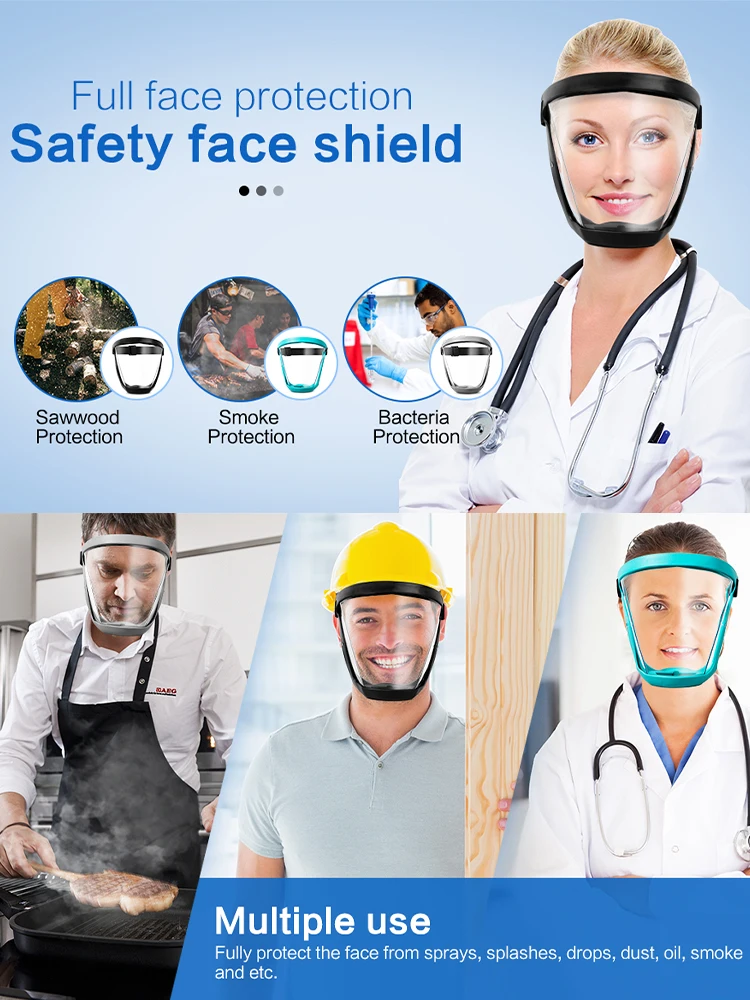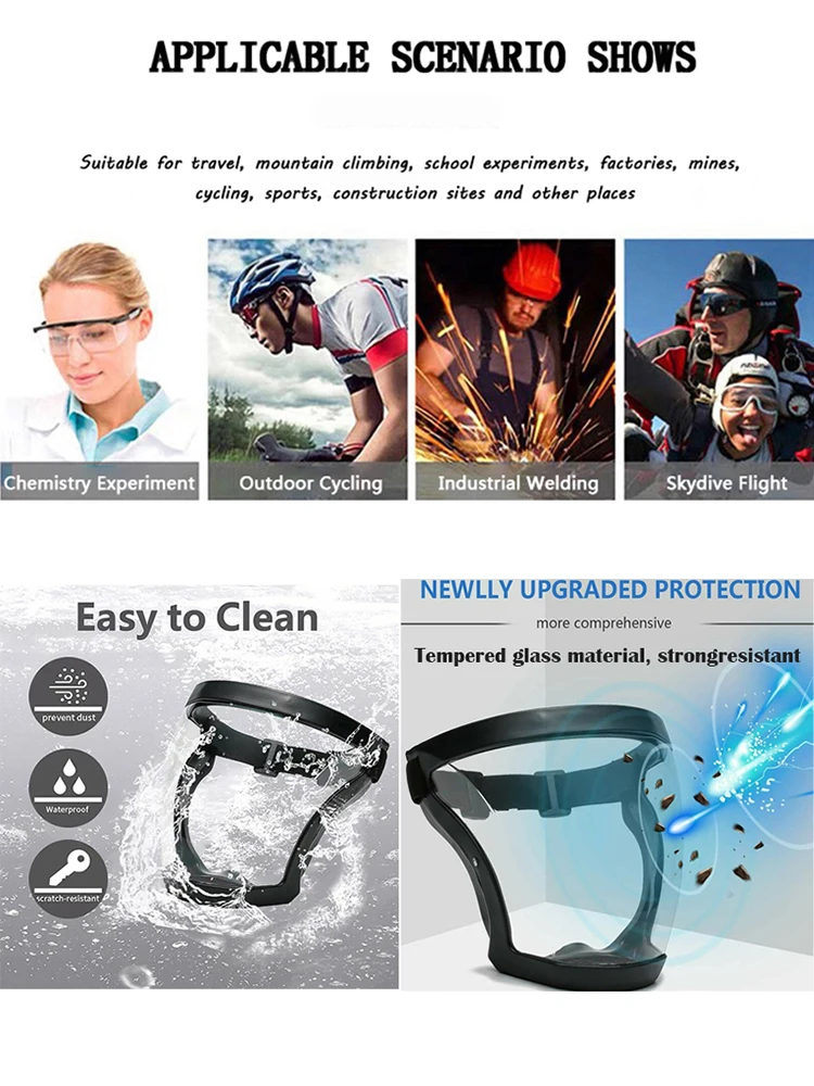 【Total Protection】Clear, lightweight, comfortable and breathable, ideal for protecting eyes, mouth and nose from flying debris, water droplets, aerosols, sprays and splashes.The well-designed product outline can even be used as a bicycle wind deflector. Practical design, the product is suitable for protecting eyes, nose and mouth, suitable for any indoor or outdoor activities, and can effectively prevent kitchen fumes and dust.